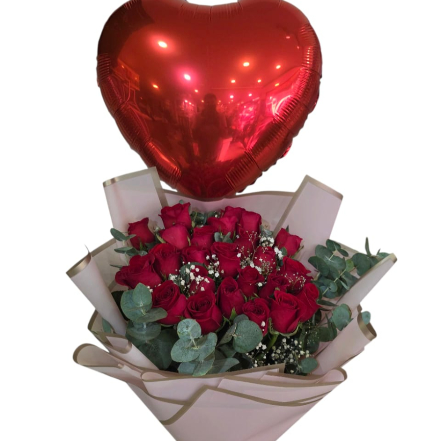 BOUQUET CCOMPUESTO DE 24 ROSAS ROJAS DE INVERNADERO CON FOLLAJE ENVUELAS CON PAPEL COREANO DECORARTIVO Y 1 GLOBO EN FORMA DE CORAZÓN