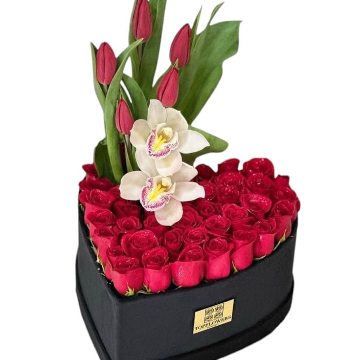 CAJA EN FORMA DE CORAZON CON 36 ROSAS ROJAS,TULIPANES Y ELEGANTES ORQUIDEAS CIMBYDIUM