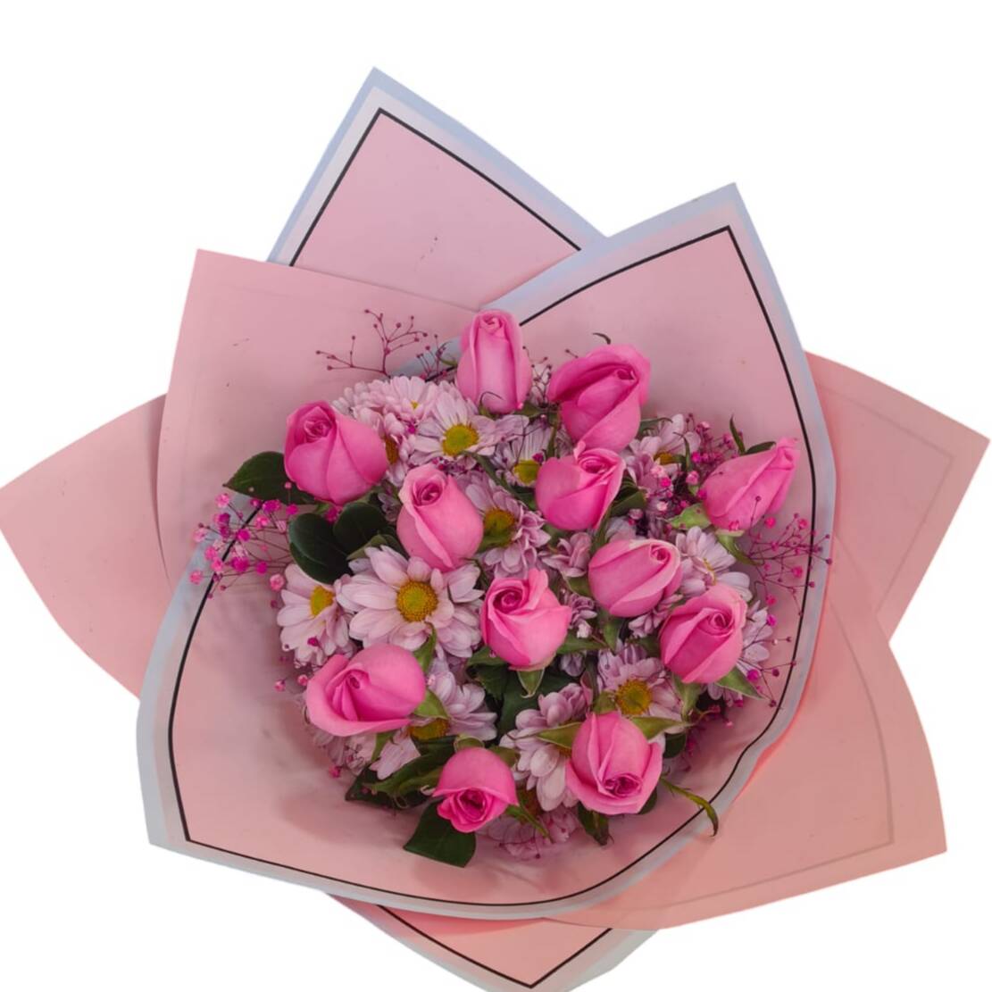 RAMO DE 12 ROSAS ROSAS TIPÓ AMERICANO ACOMPAÑADO DE FOLLAJE Y PAPEL DECORATIVO.