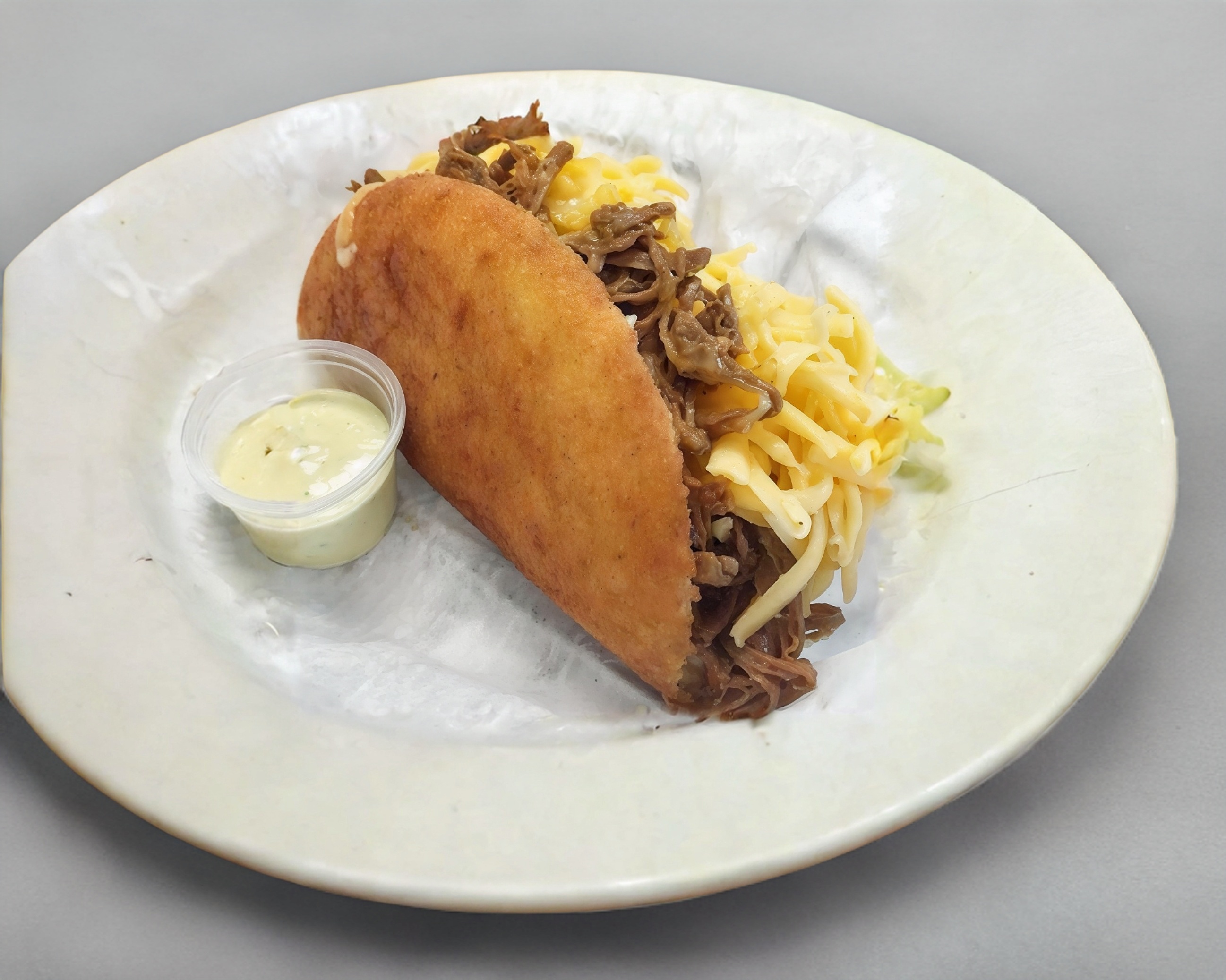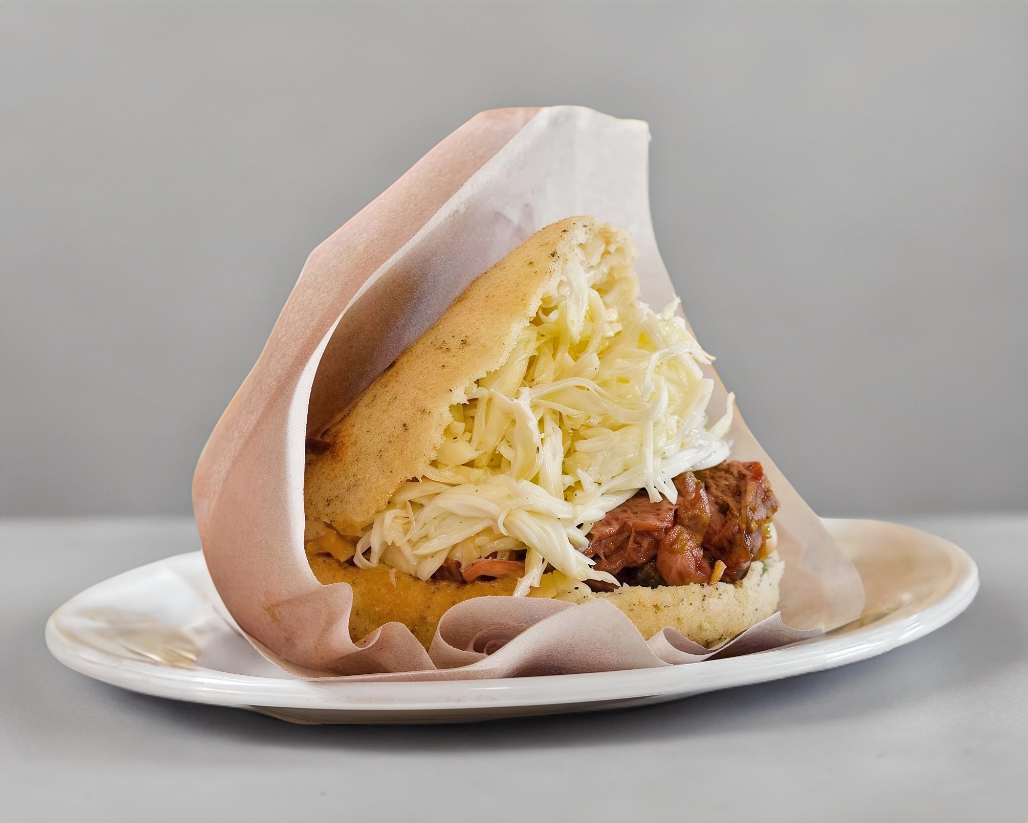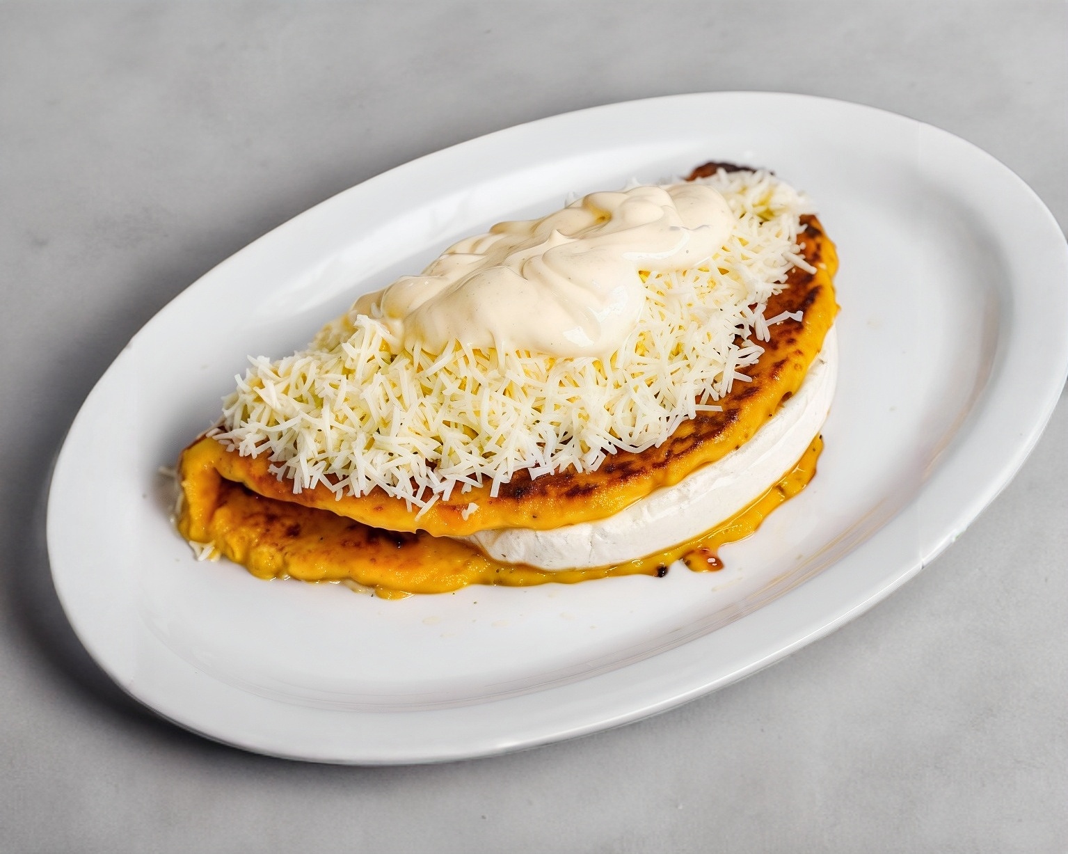 Con mantequilla, queso de mano, carne mechada, topping de queso blanco y nata del chef.