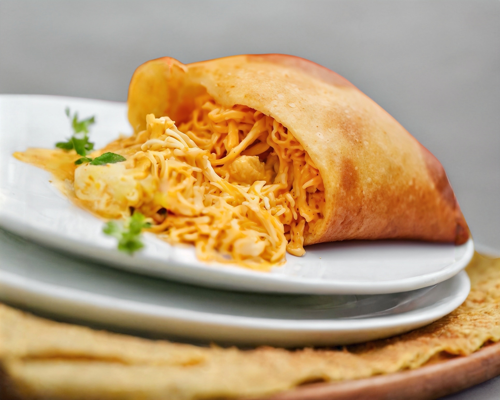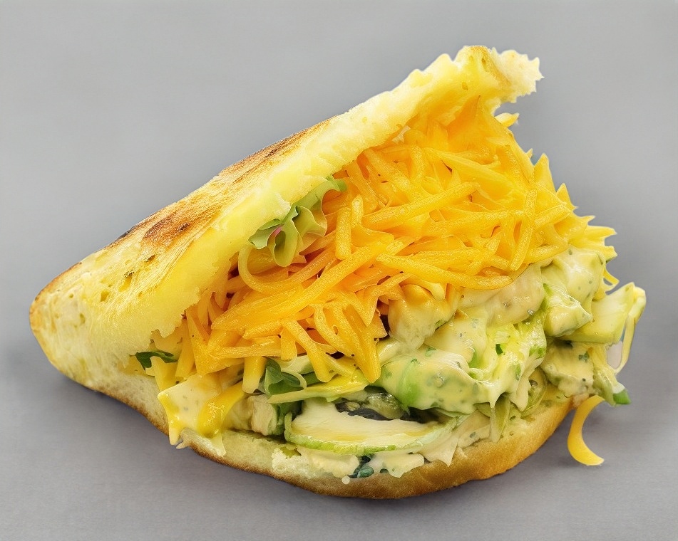 Con mantequilla, queso de mano, pollo deshebrado, aguacate, mayonesa del chef, topping de queso blanco y nata del chef.