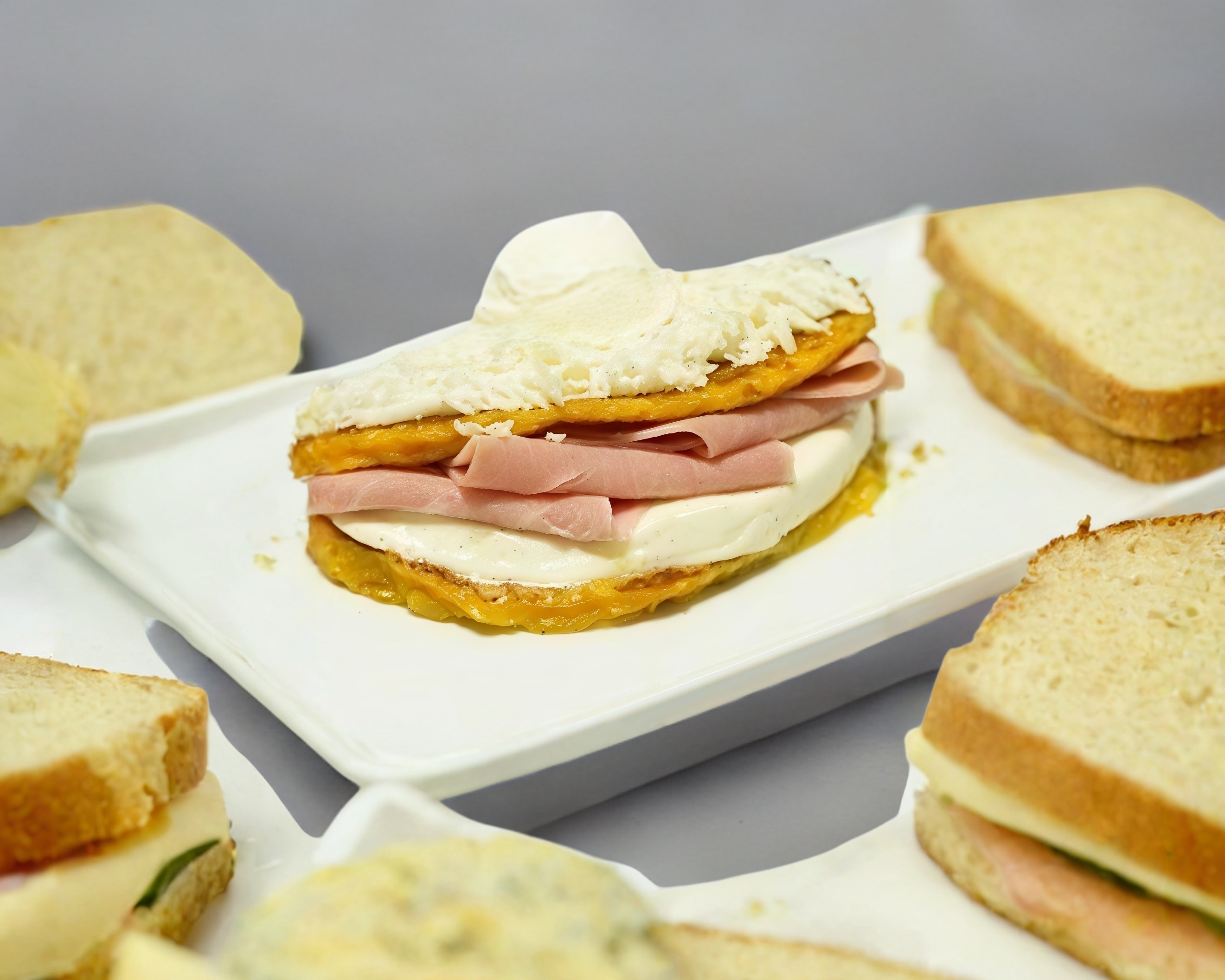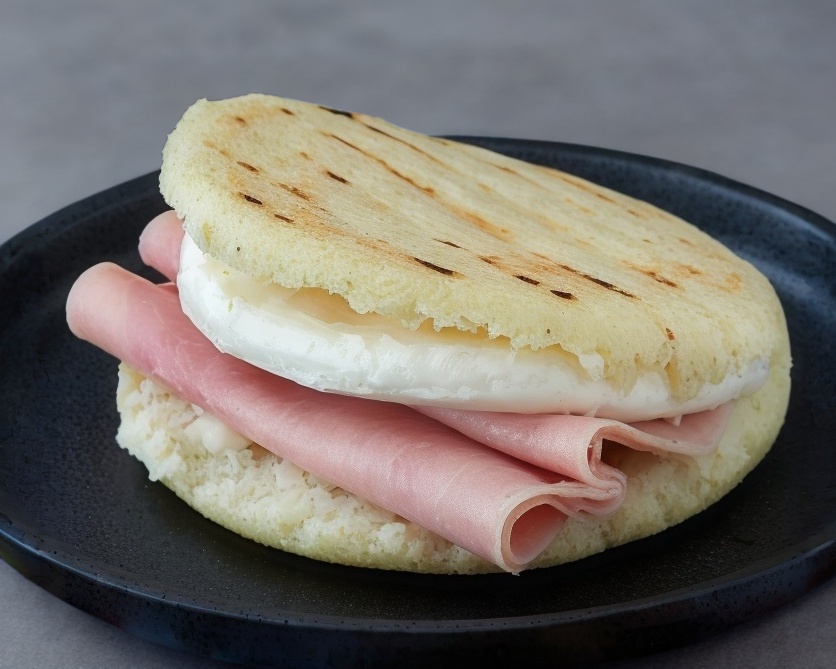 Con mantequilla, queso de mano, jamón, topping de queso blanco y nata del chef.