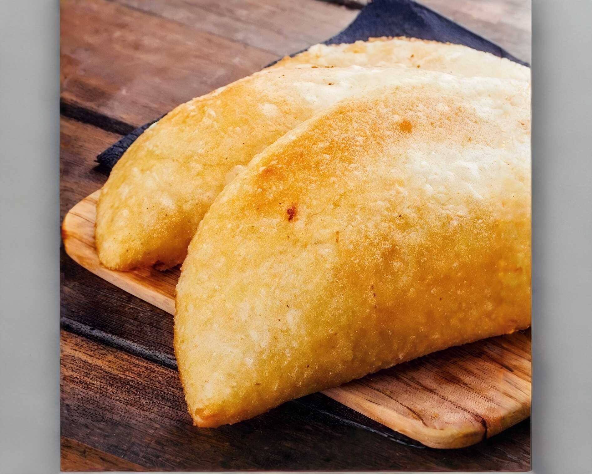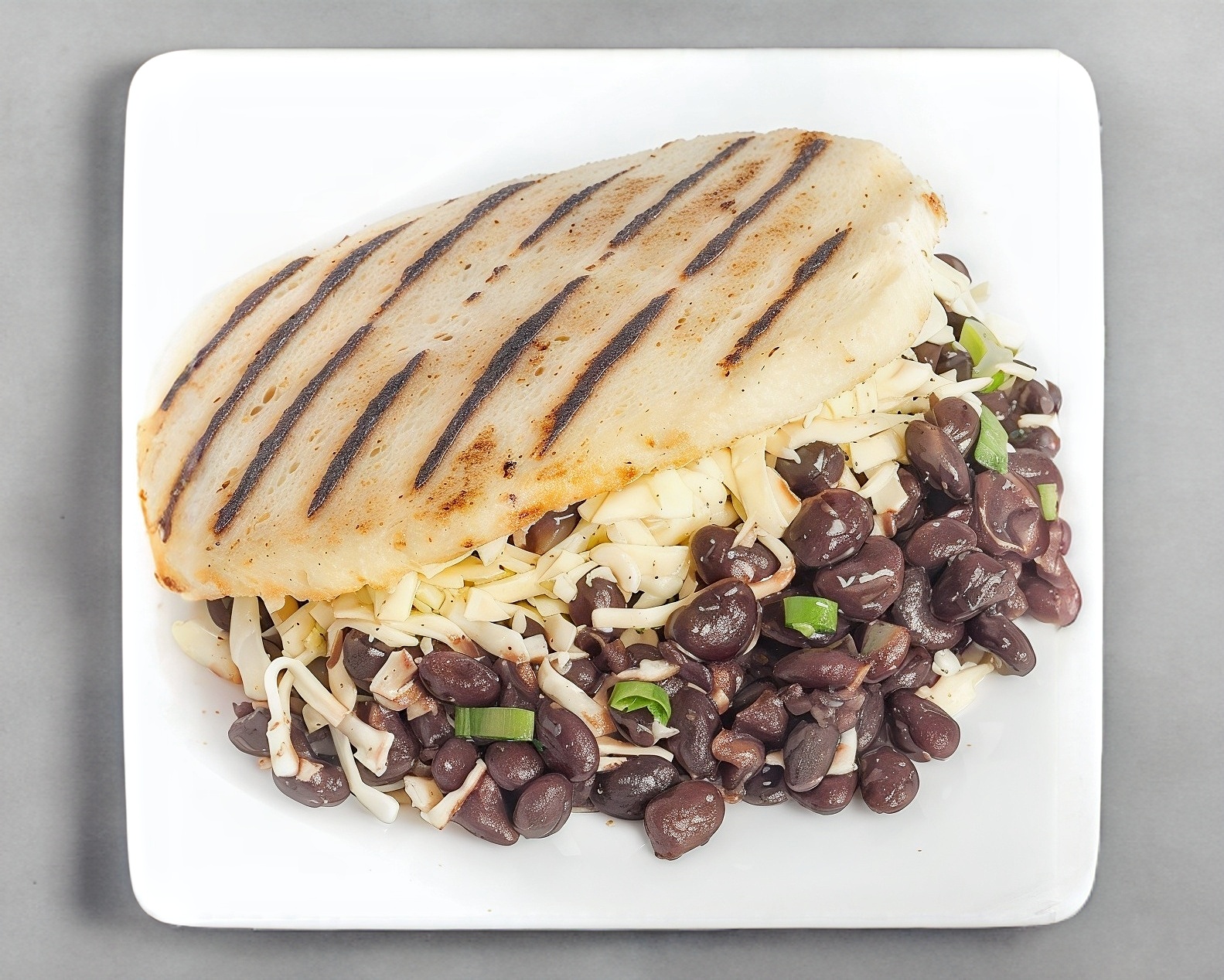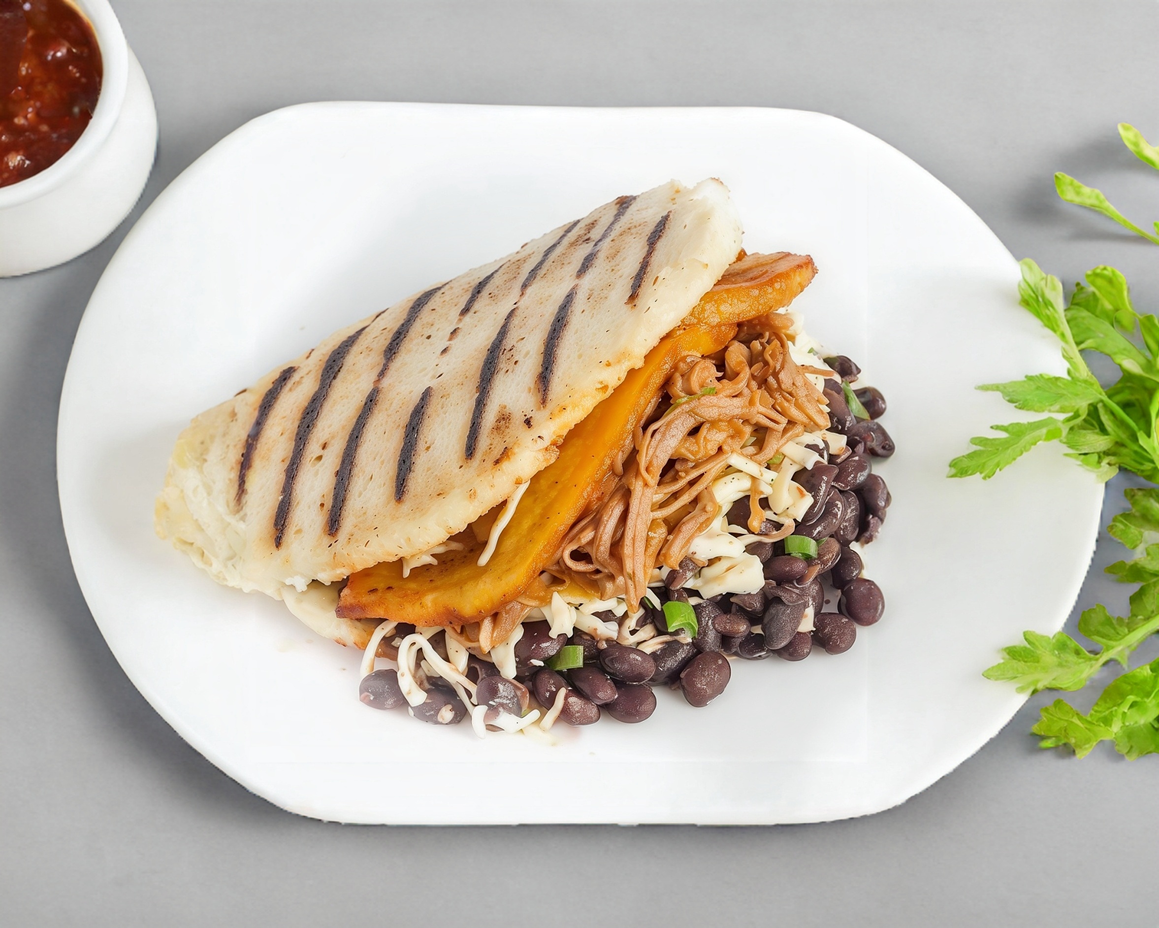 Rellena de carne de res deshebrada en guiso criollo, queso blanco, frijoles negros y tajadas.