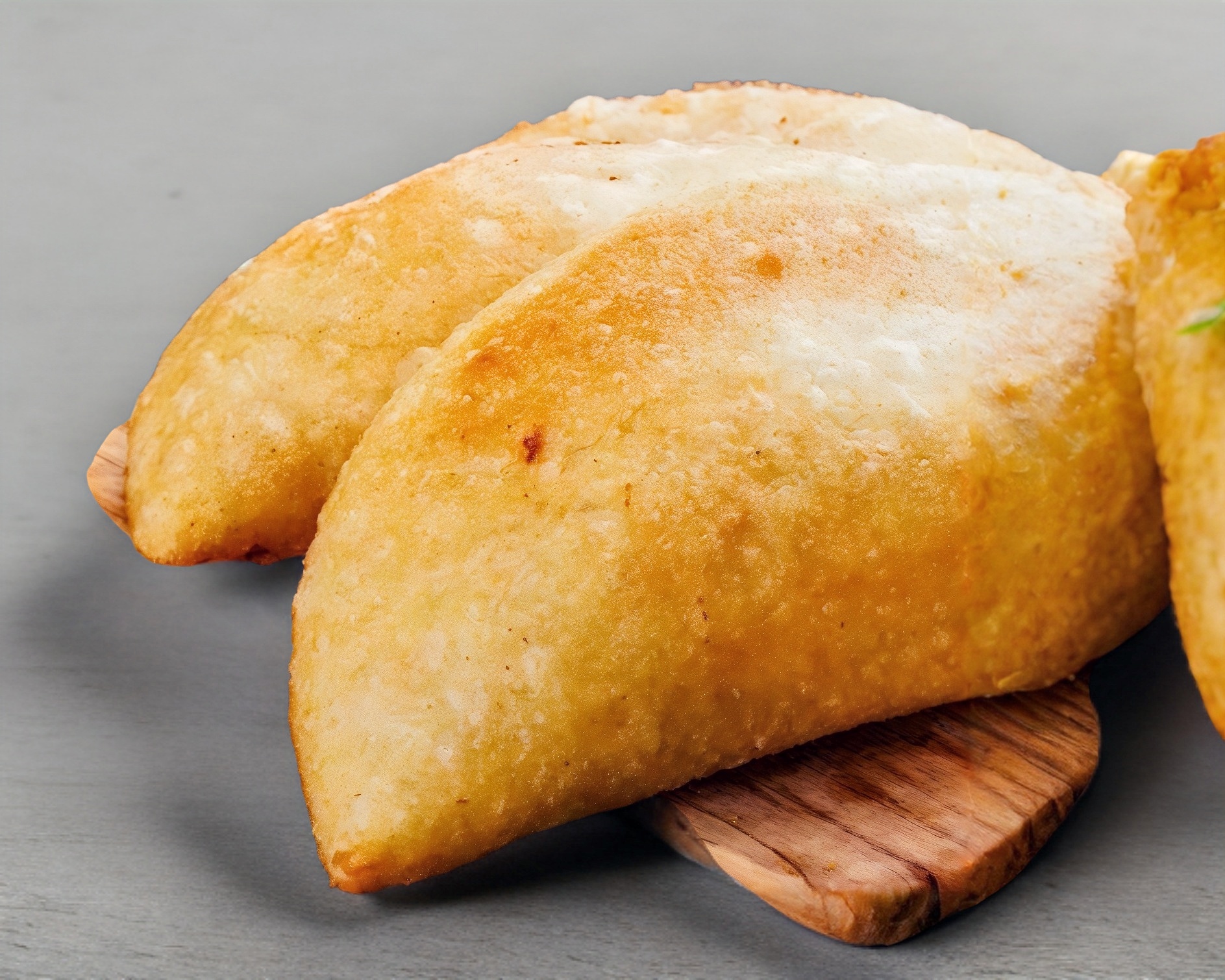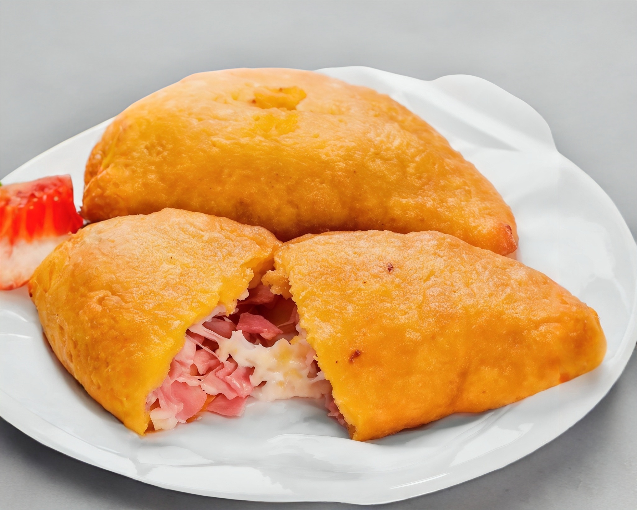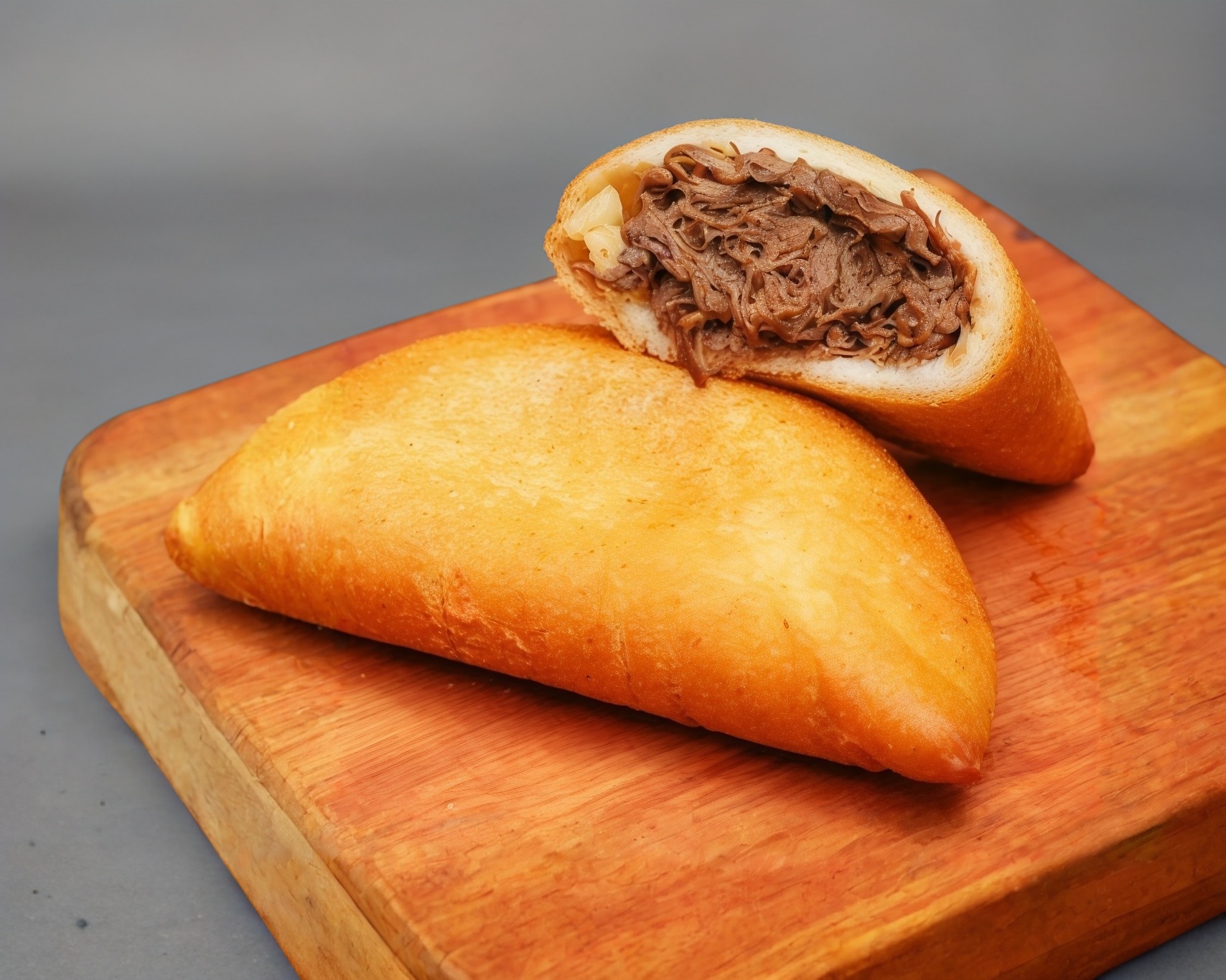 Rellena de carne de res deshebrada en guiso criollo, queso blanco, frijoles negros y tajadas.
