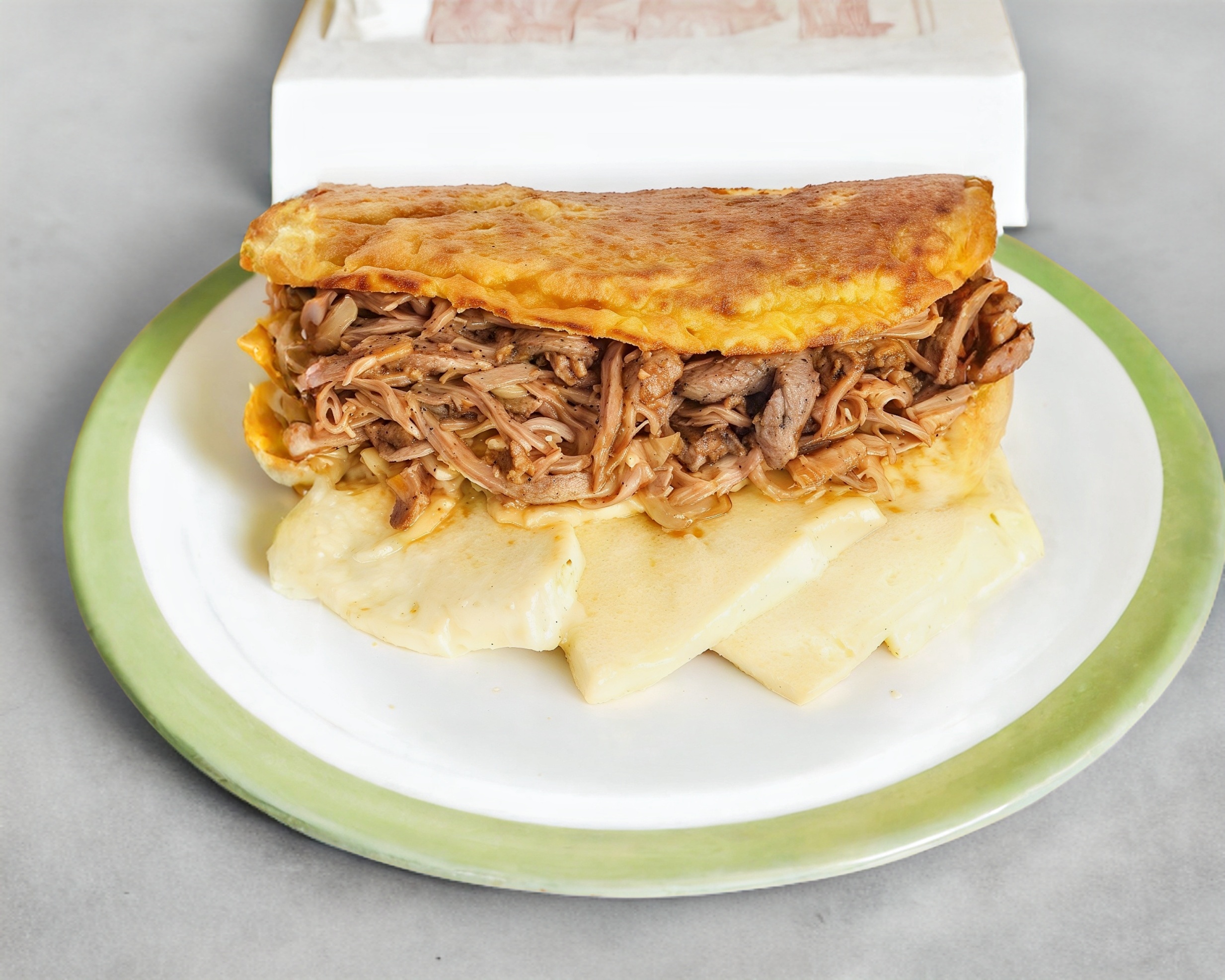 Nuestro desayuno criollo viene con todo: arepa recién hecha, nuestra sazón especial en la carne mechada, caraotas negras caseras y una montaña de queso blanco. Servido con huevos revueltos suaves y clásicos (sin vegetales). Un desayuno completo para recargar energías.