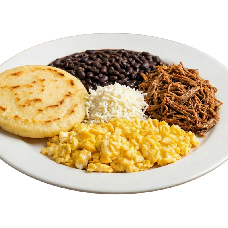 Nuestro desayuno criollo viene con todo: arepa recién hecha, nuestra sazón especial en la carne mechada, caraotas negras caseras y una montaña de queso blanco. Servido con huevos revueltos suaves y clásicos (sin vegetales). Un desayuno completo para recargar energías.