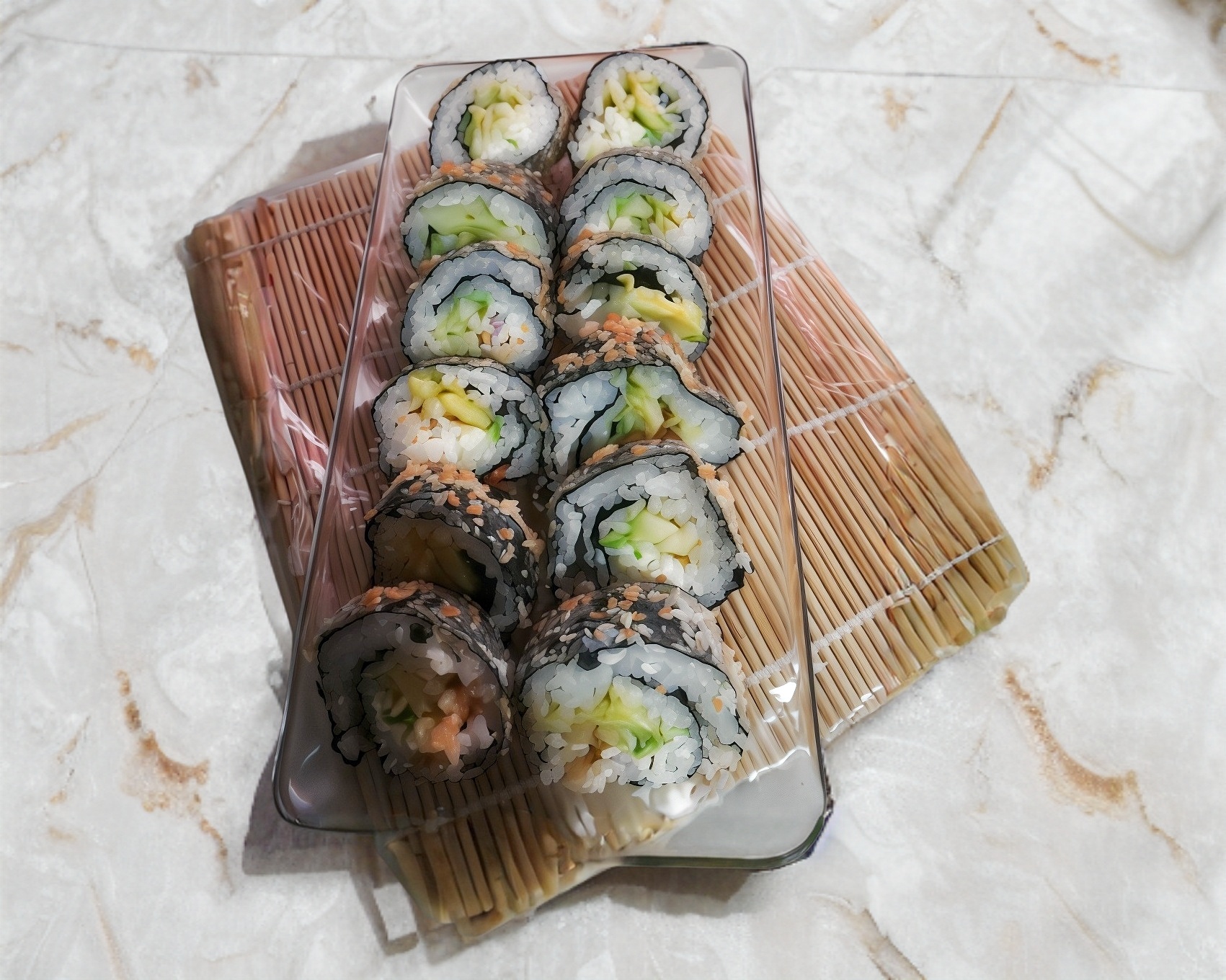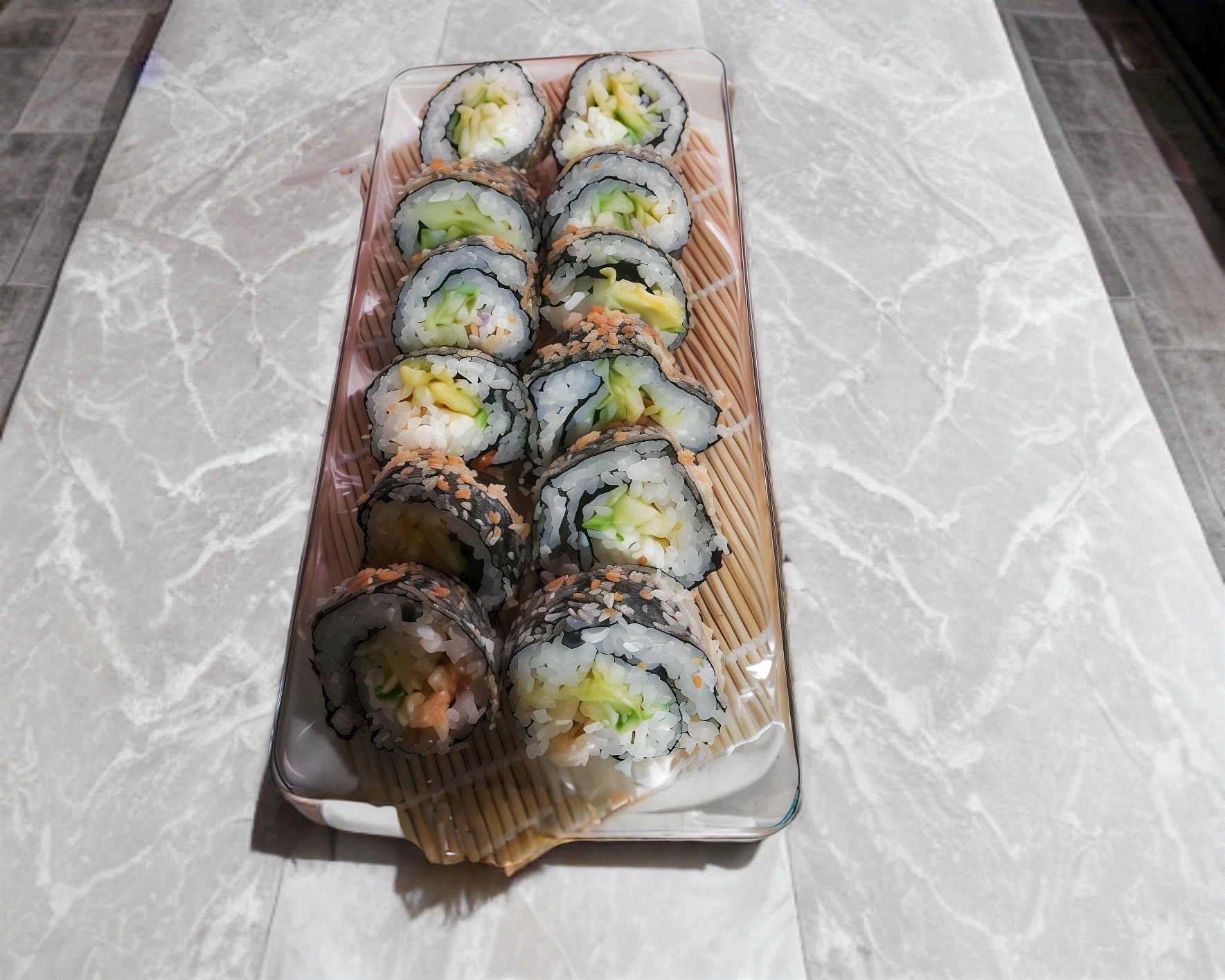 Por fuera ajonjolí, por dentro camarón, queso crema, pepino y aguacate.