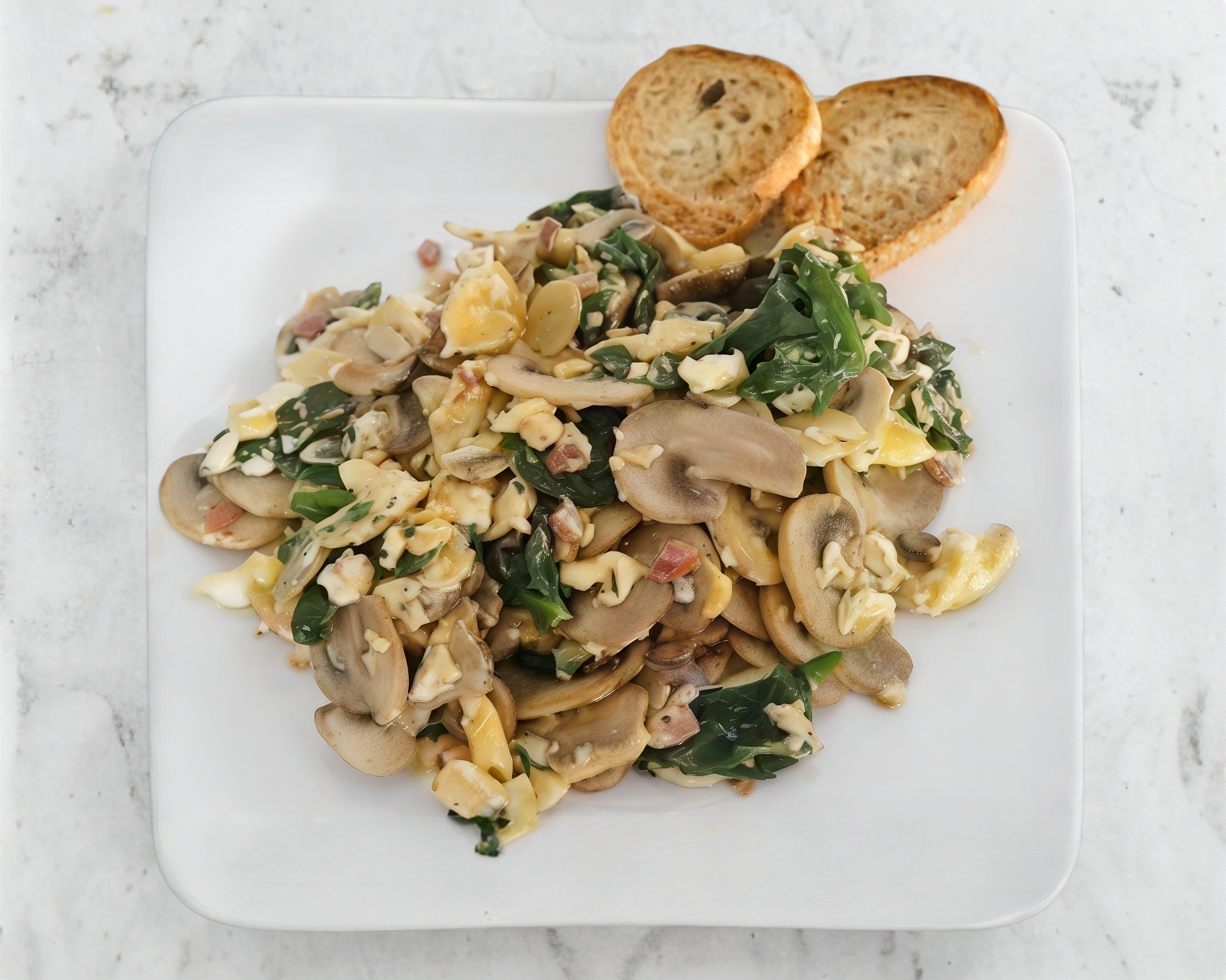 Incluye café de olla, fruta, pan blanco y 1 pan de dulce pequeño. Huevos revueltos con espinacas, champiñones y elotitos, acompañados de frijoles negros.