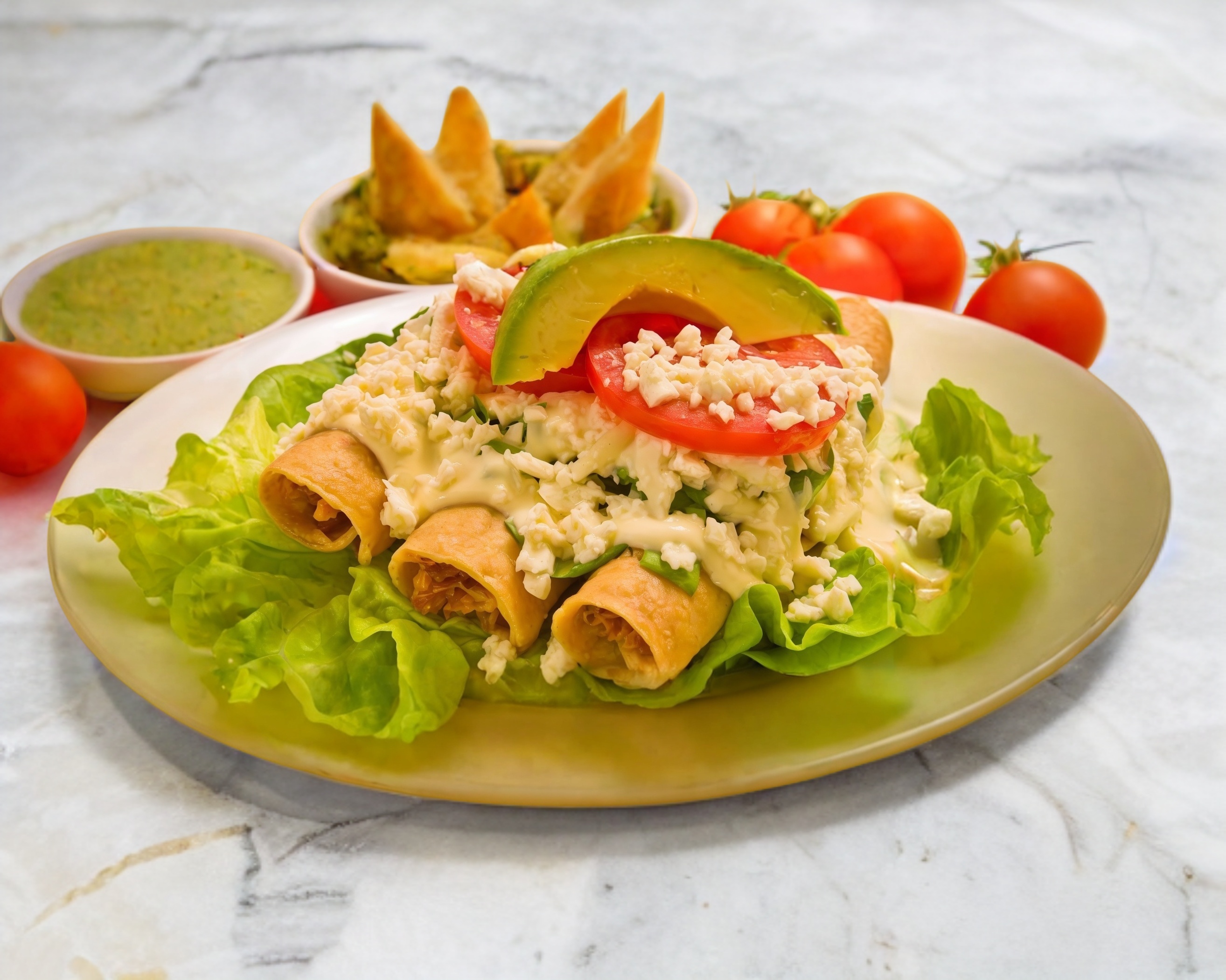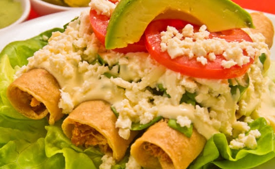 3 Piezas de flutas, acompañadas con lechuga, crema, queso y aguacate.