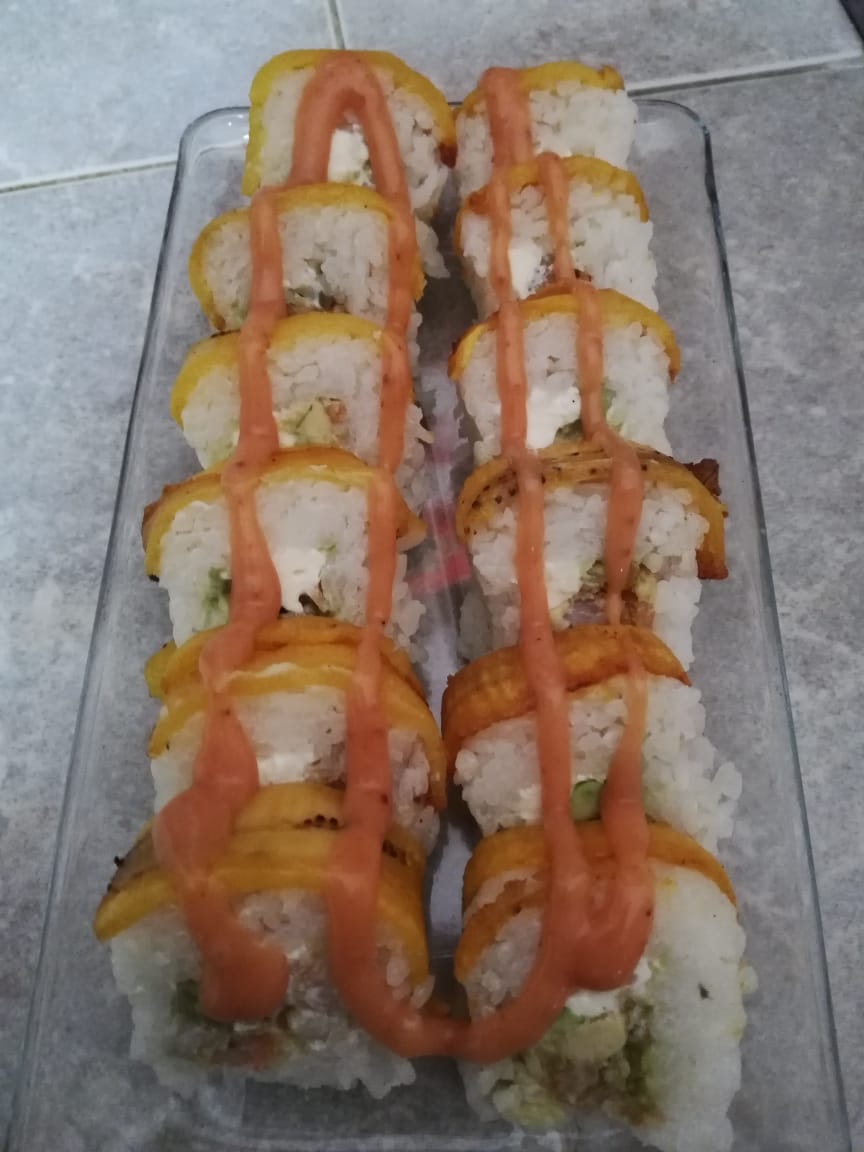 Por fuera plátano macho y salsa kushiague, por dentro camarón kushiague, coco rayado, queso crema y aguacate.