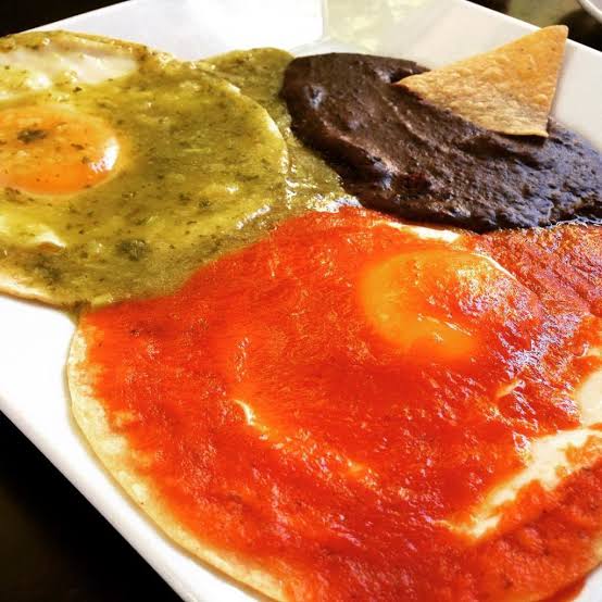 Verdes o rojos con 2 huevos, acompañados con frijoles negros, incluyen café de olla, fruta, pan blanco y 1 pan de dulce pequeño.
