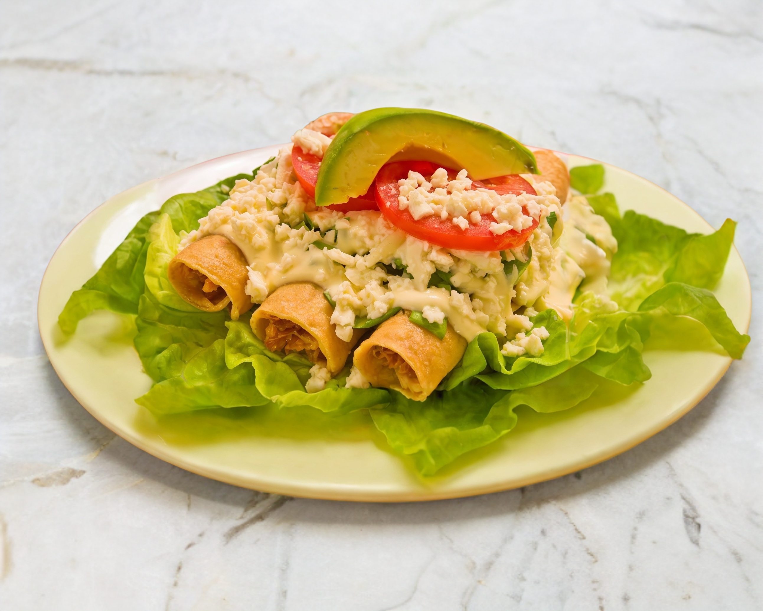 3 Piezas de flautas, acompañadas de lechuga, crema, queso y aguacate.