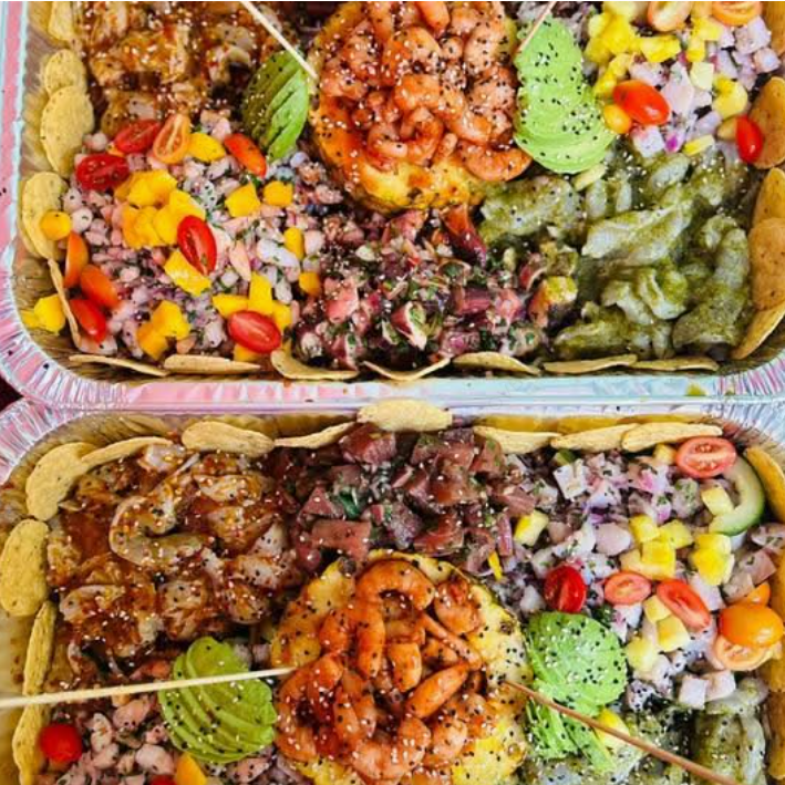 Camarón cocido, aguachiles, atún, pulpo y ceviche mixto con aguacate, salsas de la casa y un toque secreto, 5 a 6 Personas.