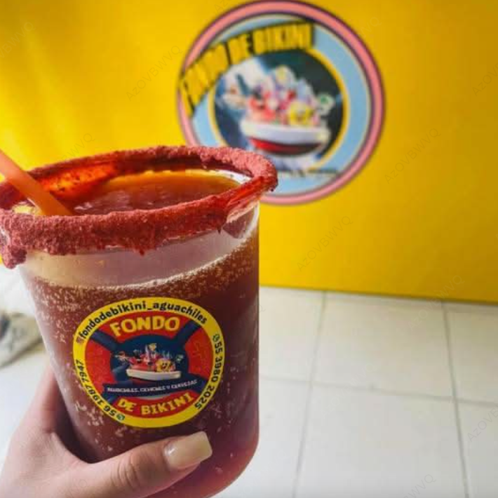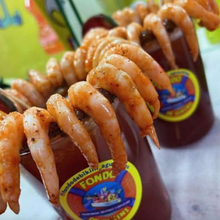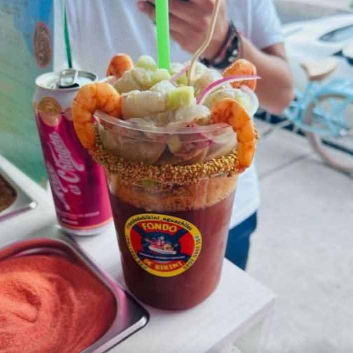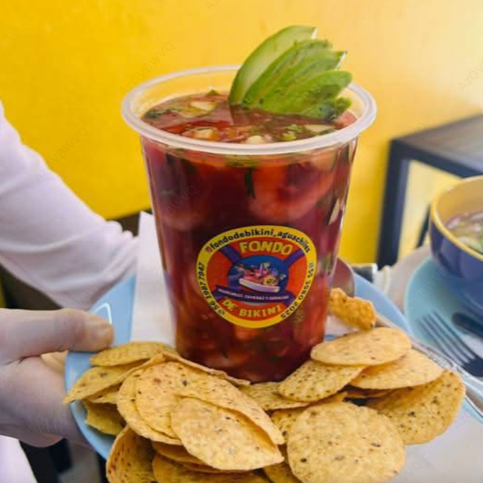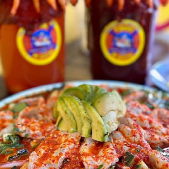 Aguachile o ceviche de tu elección, clamato, maggi, salsa inglesa, limón y sal.