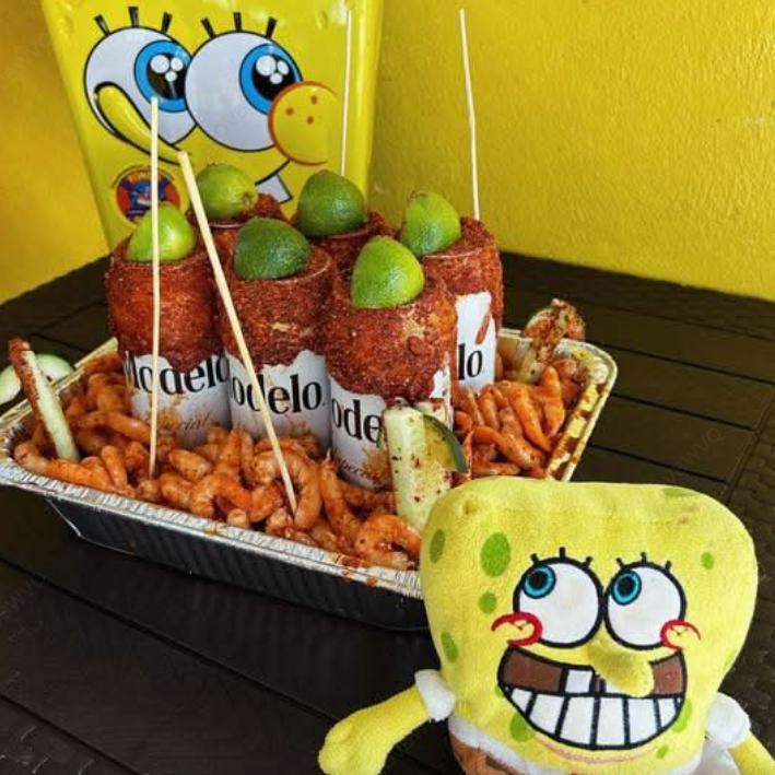 Cerillito escarchado con tu cerveza y pulpa favorita y una brocheta de camarones en salsas negras.