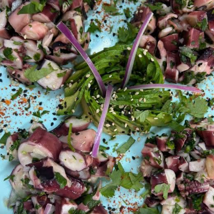 Pulpo fresco previamente marinado con cebolla morada, cilantro, serrano, aguacate y un toque de aceite de oliva (200 g).