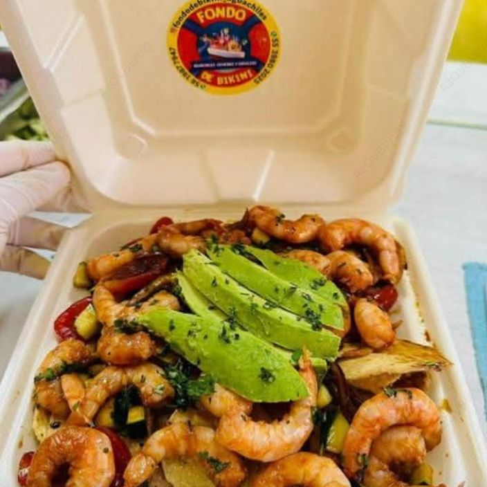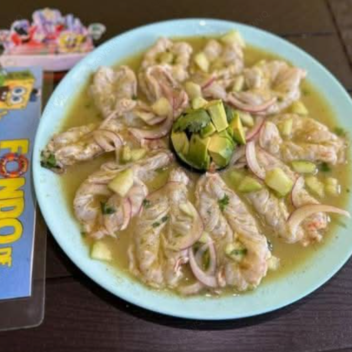Camarón fresco, pepino, cebollita morada, mango, piña, aguacate y una salsa de chile serrano, (200 g).