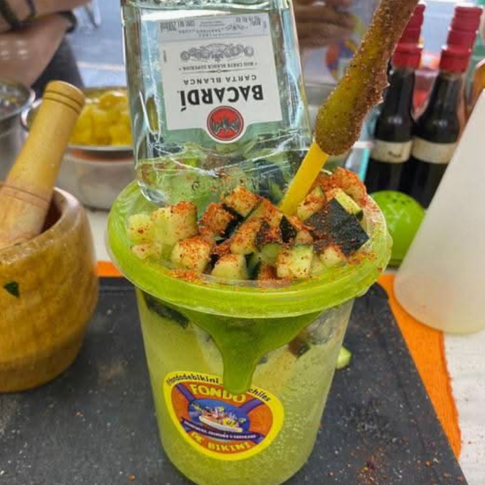 Tu escarchado favorito, tu cerveza favorita, maggi, salsa inglesa, salsa valentina, clamato, limón y sal.