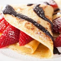 Delisiosa crepa rellena de Nutella y fresas naturales, decorada con lechera y chispas de colores.