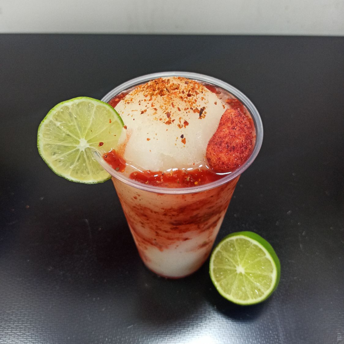 Bebida fría a base de hielo, agua y fruta natural, acompañada de chamoy, Tajín y gomita enchilada y vaso adornado con chamoy y Tajín.