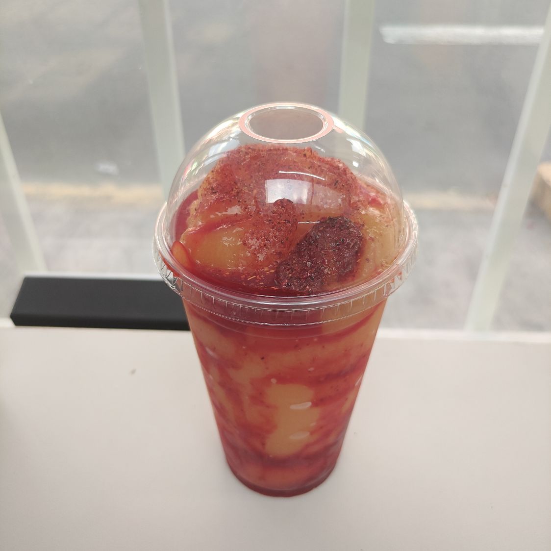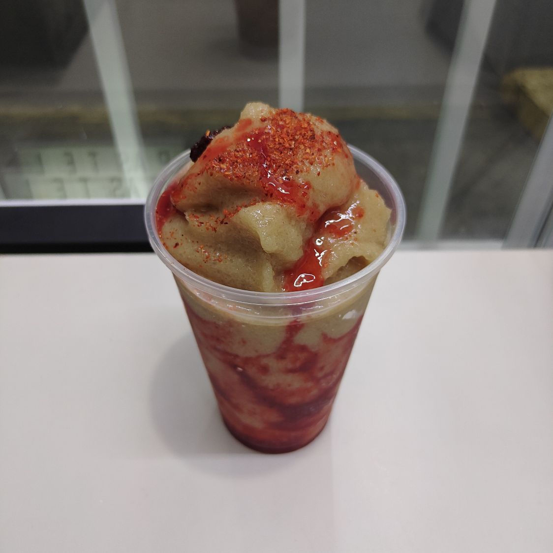Bebida fría a base de hielo, agua y fruta natural, acompañada de chamoy, tajín y gomita enchilada y vaso adornado con chamoy y tajín