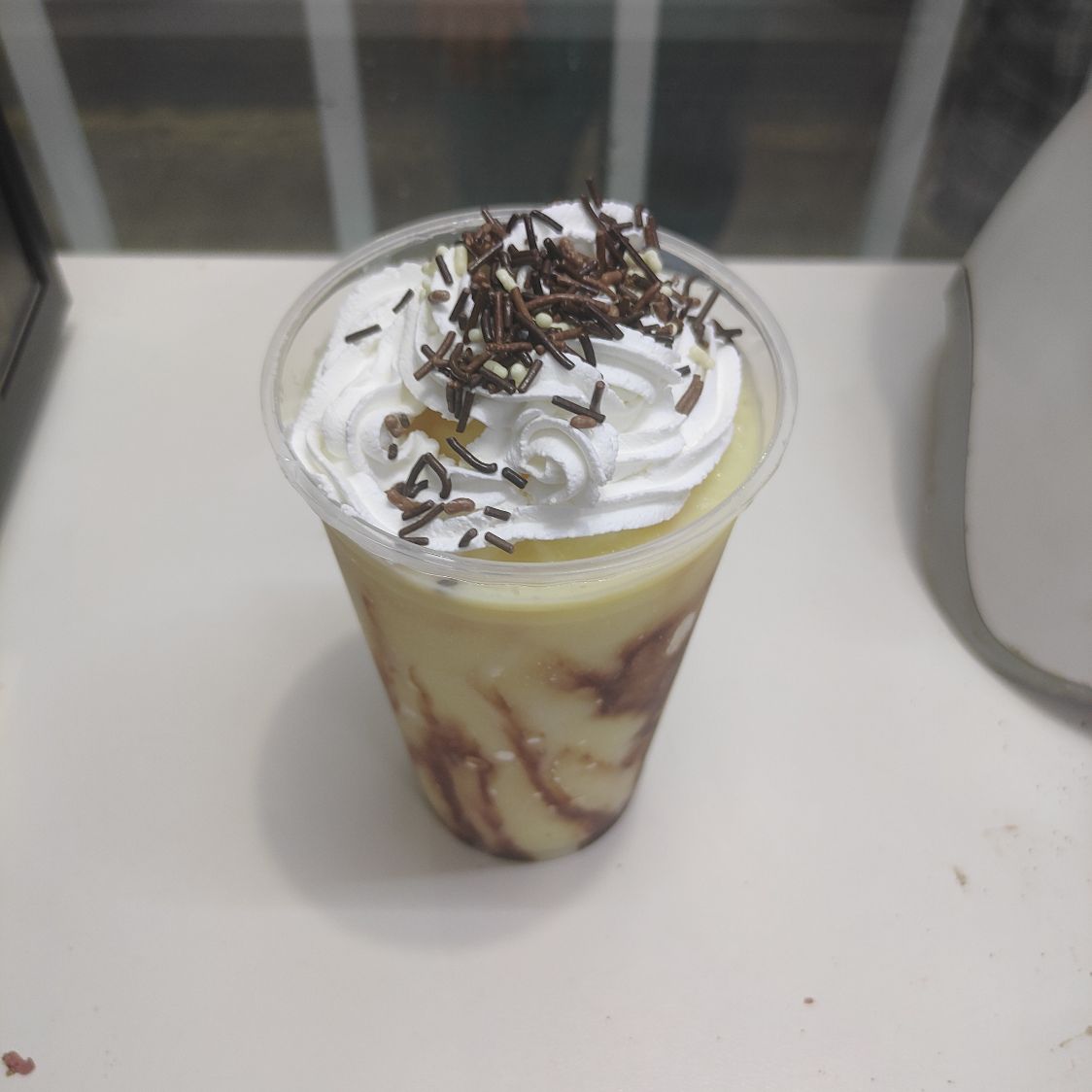 Bebida fría a base de hielo, leche y rompope, con cubierta de crema batida y chispas de chocolate.