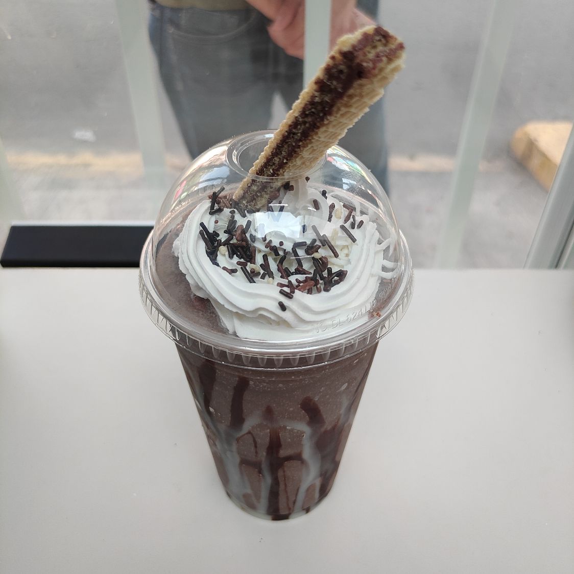 Bebida fría a base de hielo, leche y chocolate, con cubierta de crema batida y chispas de chocolate.