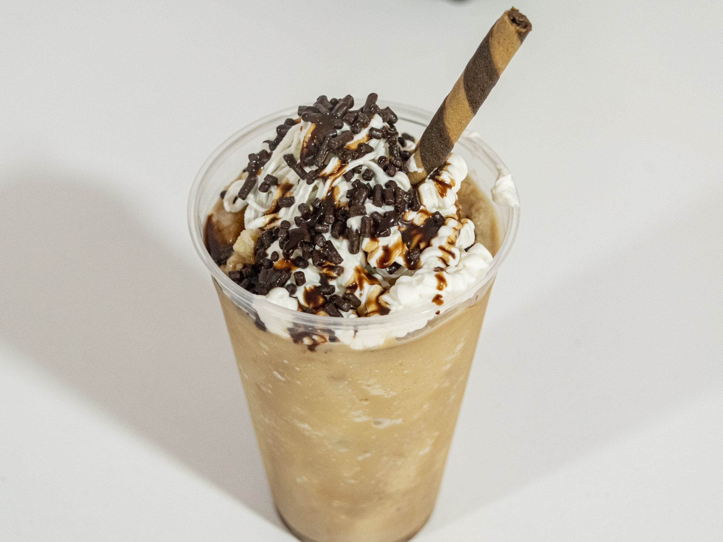 Vaso cubierto con una jalea, base de crema, fruta, base de crema, toping, base de fresa, base de crema, chantilly y toping