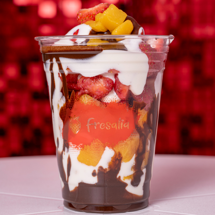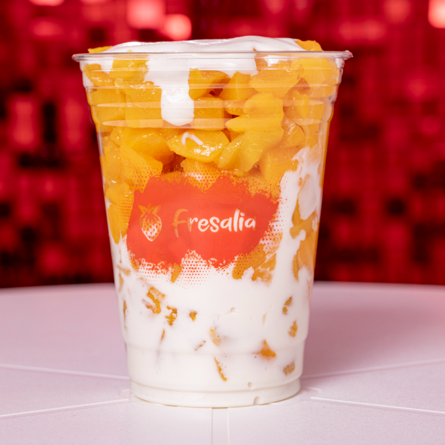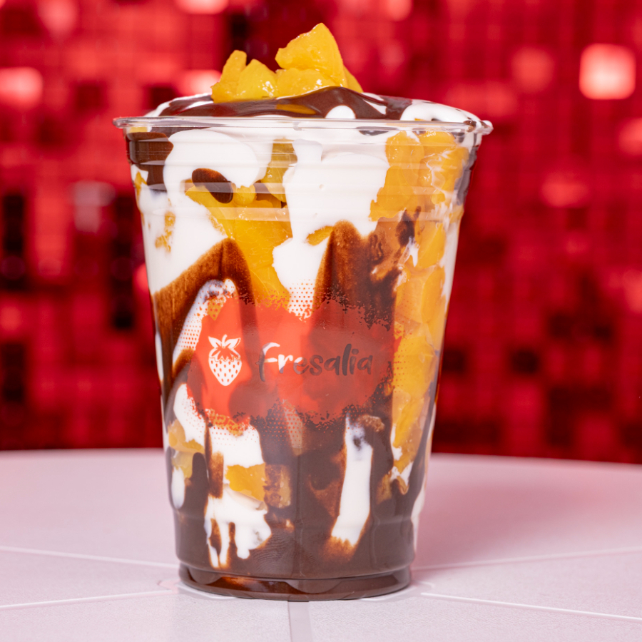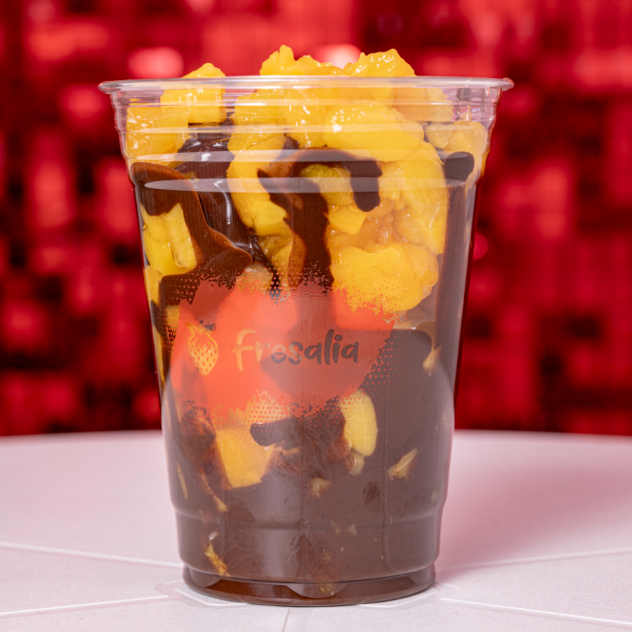 Trozos de durazno fresco con crema de chocolate, presentado en porción de tamaño chico.