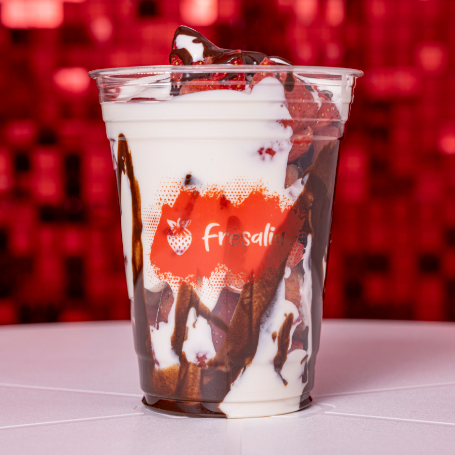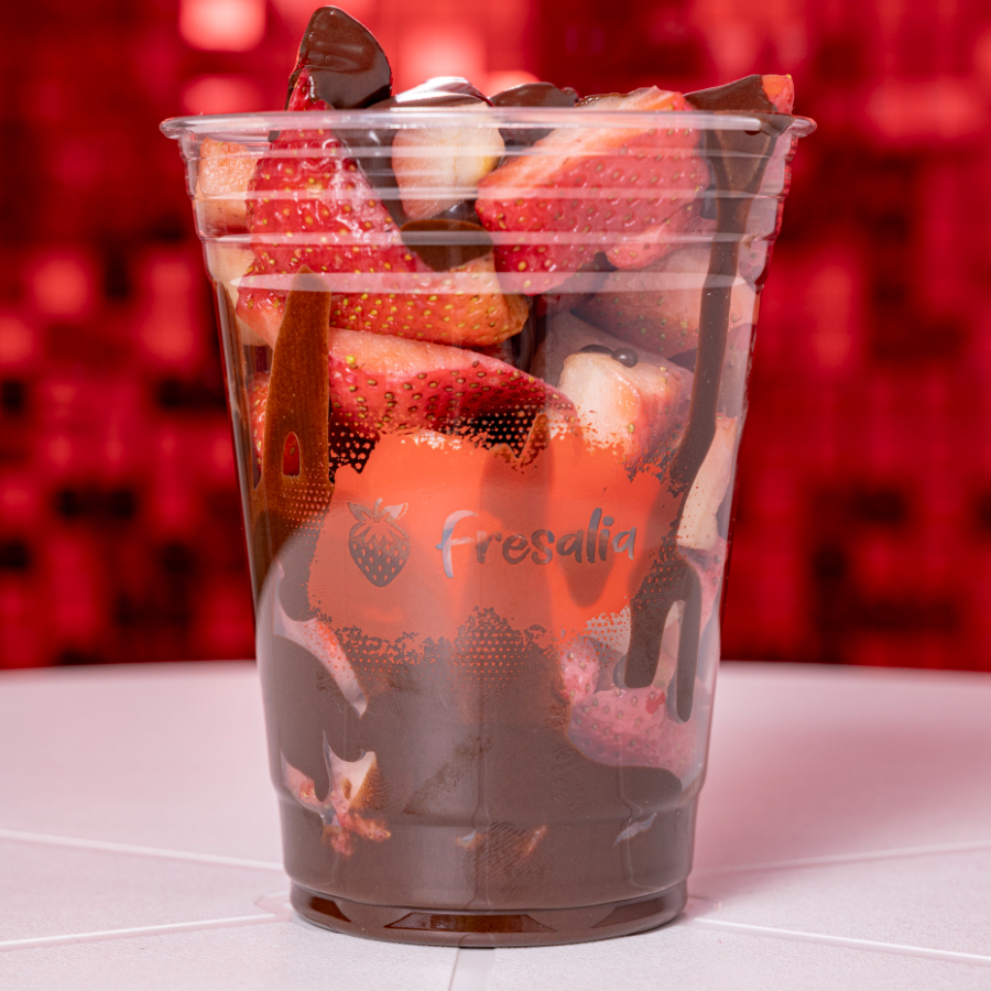 Porción mediana de fresas frescas cubiertas con una capa de chocolate.