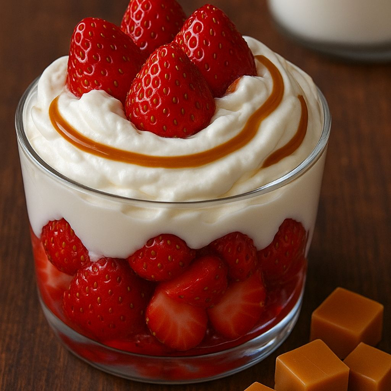 Fresas con Crema Caramel Toffee ✨ Jugosas fresas frescas servidas con nuestra exclusiva crema de la casa sabor caramel toffee, de textura aterciopelada y notas sutiles de caramelo dorado y mantequilla. Una combinación única que envuelve el paladar con dulzura y equilibrio, haciendo de cada bocado un deleite artesanal.