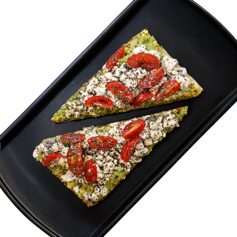 Pan de masa madre, con aguacate, queso de cabra y jitomate cherry, sazonado con limón, aceite de oliva, sal, pimienta y un toque de chía.