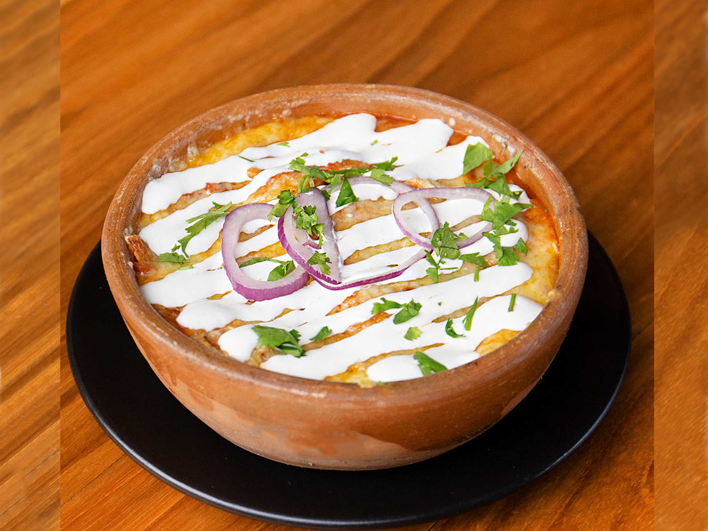 Totopos bañados en mole dulce, con frijoles, queso manchego, crema y cebolla morada, decorados con cilantro fresco.