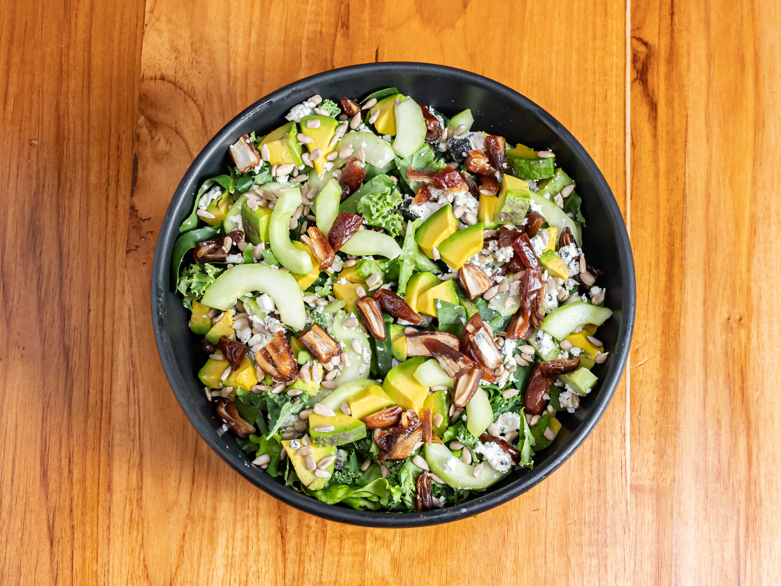 Kale, espinaca, queso de cabra, aguacate, pepino, dátiles y semillas de girasol.