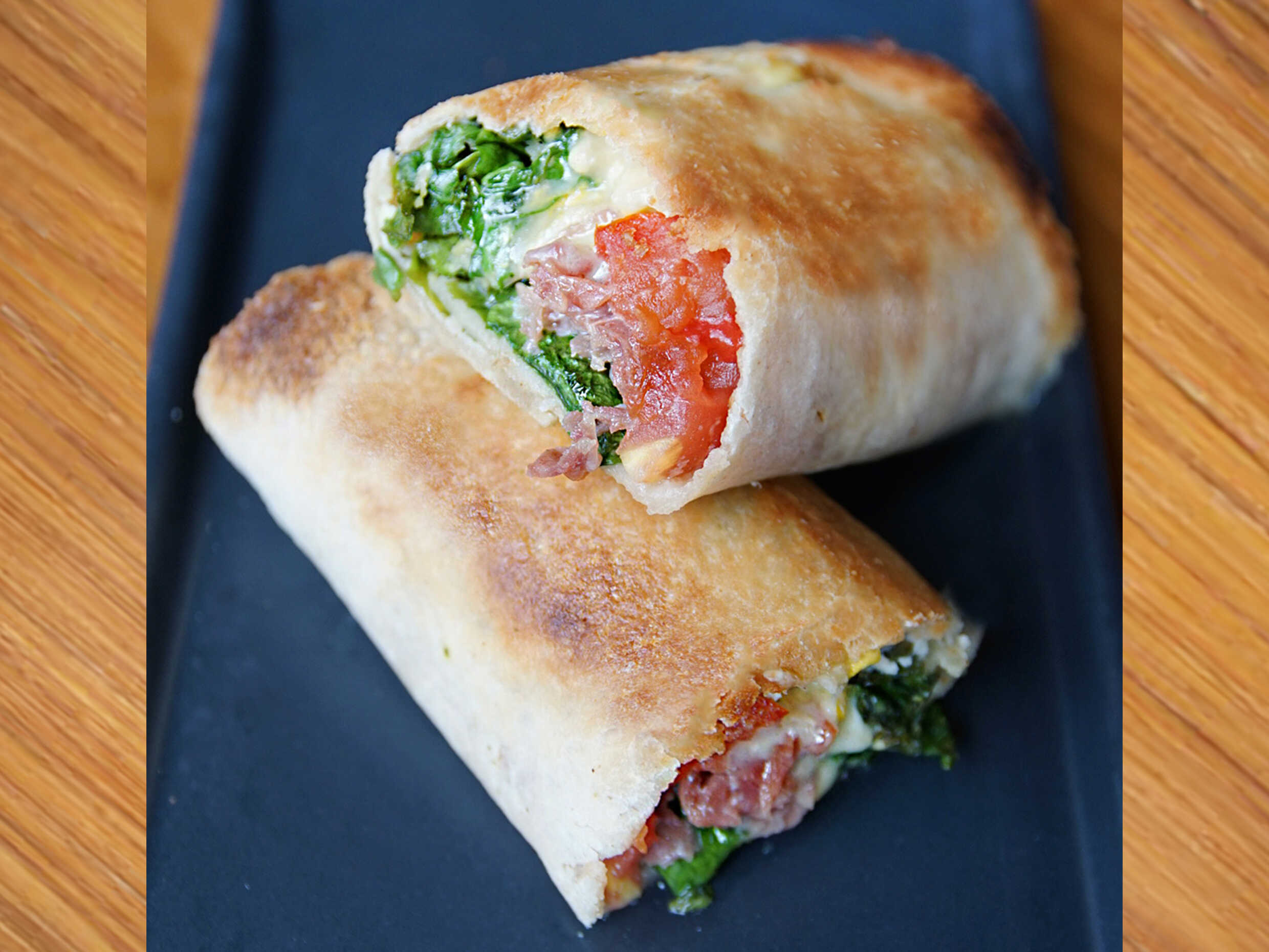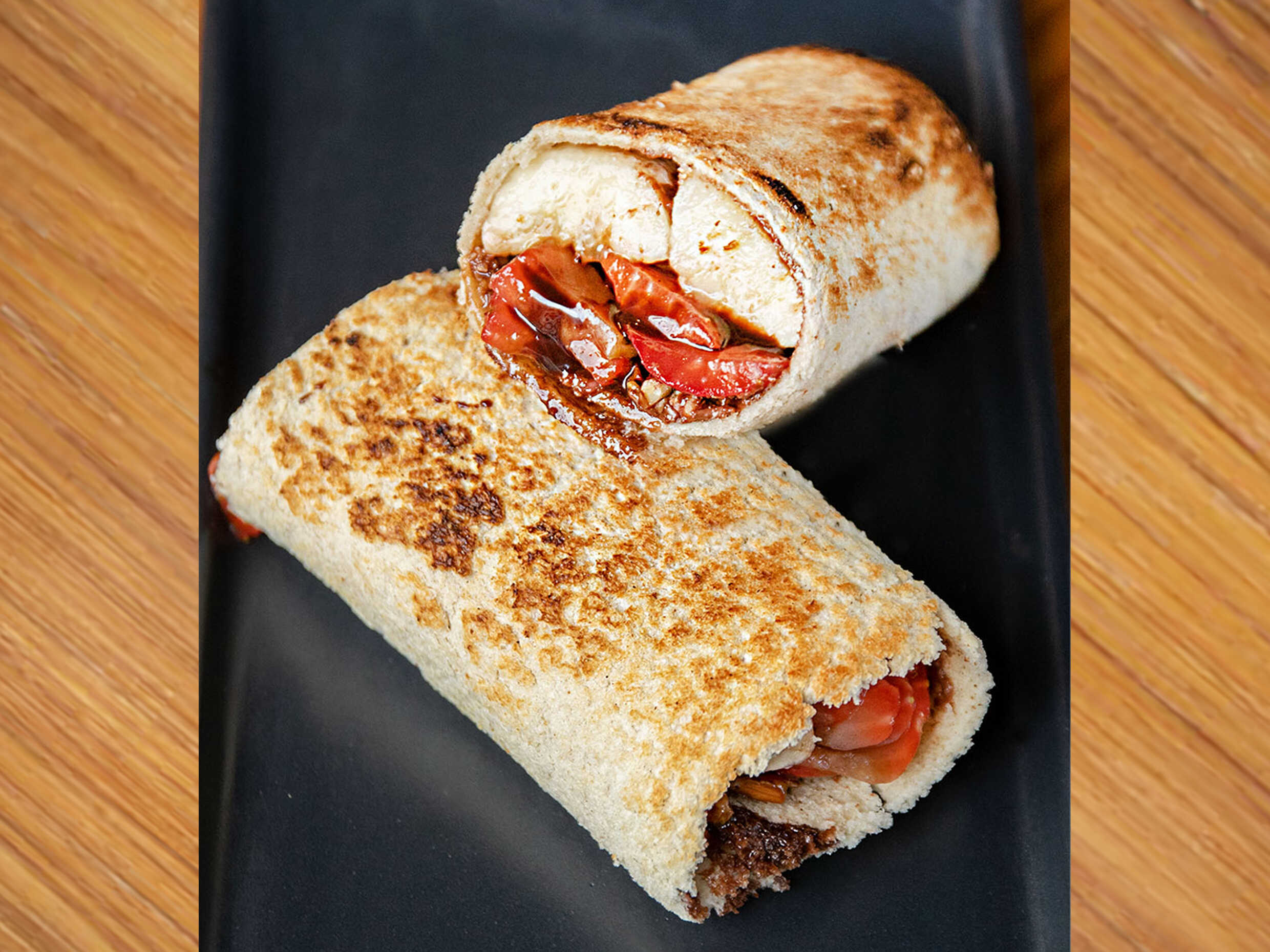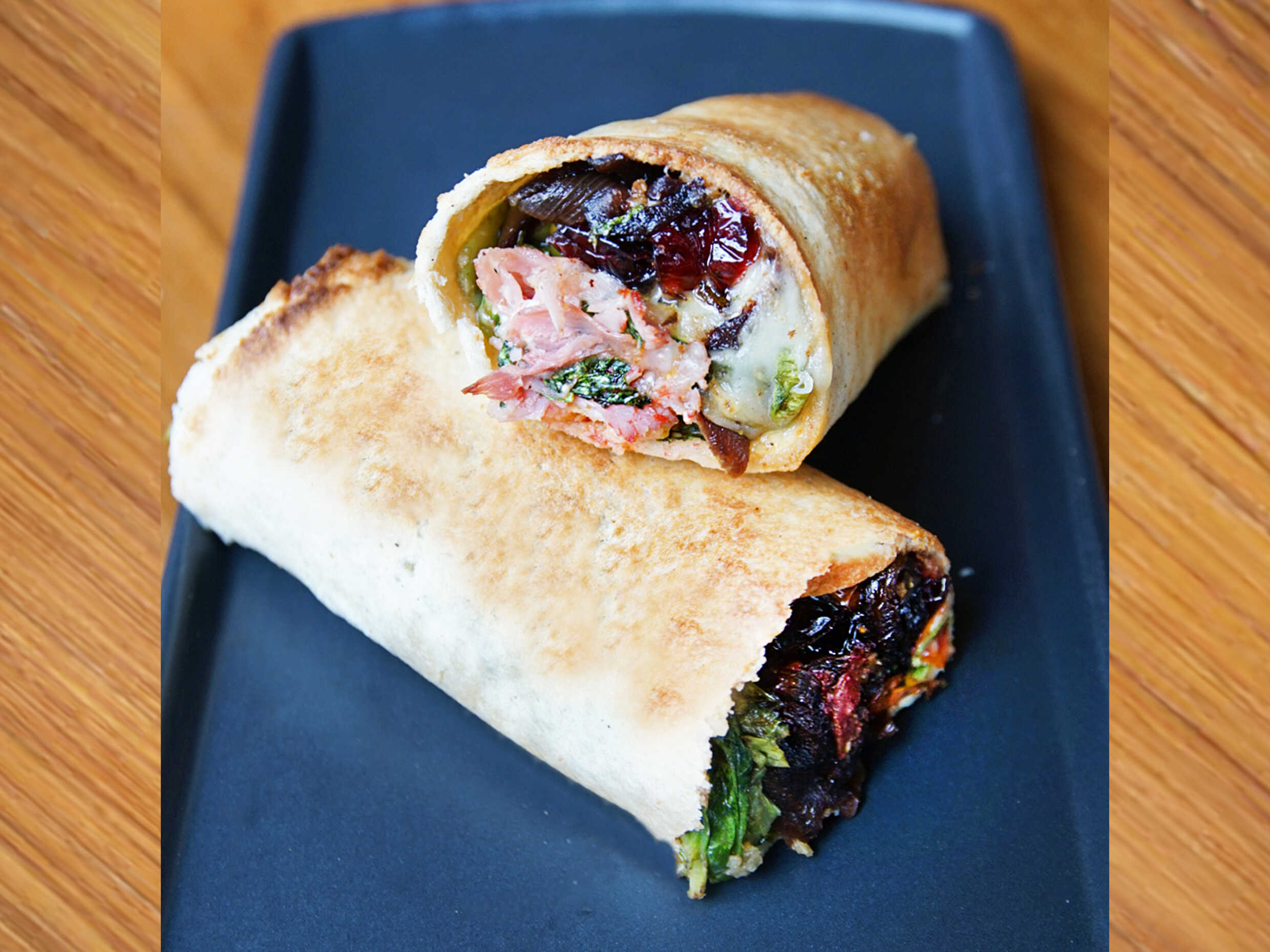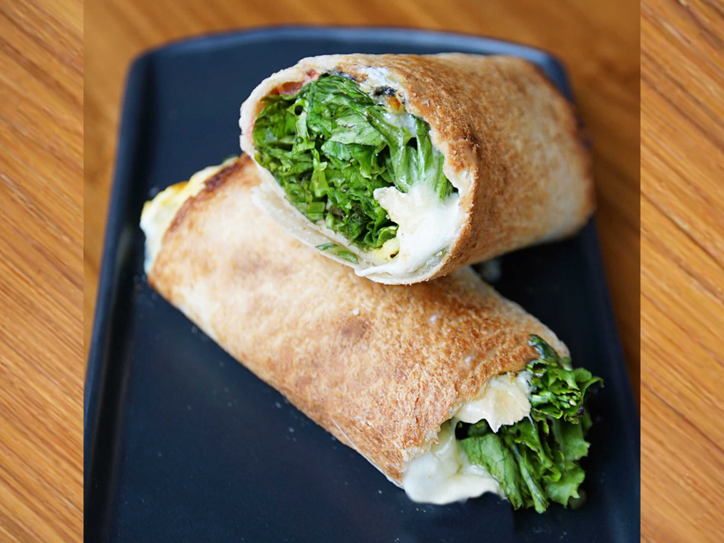 Wrap con huevos orgánicos, manchego, cebolla, chile serrano y frijoles.