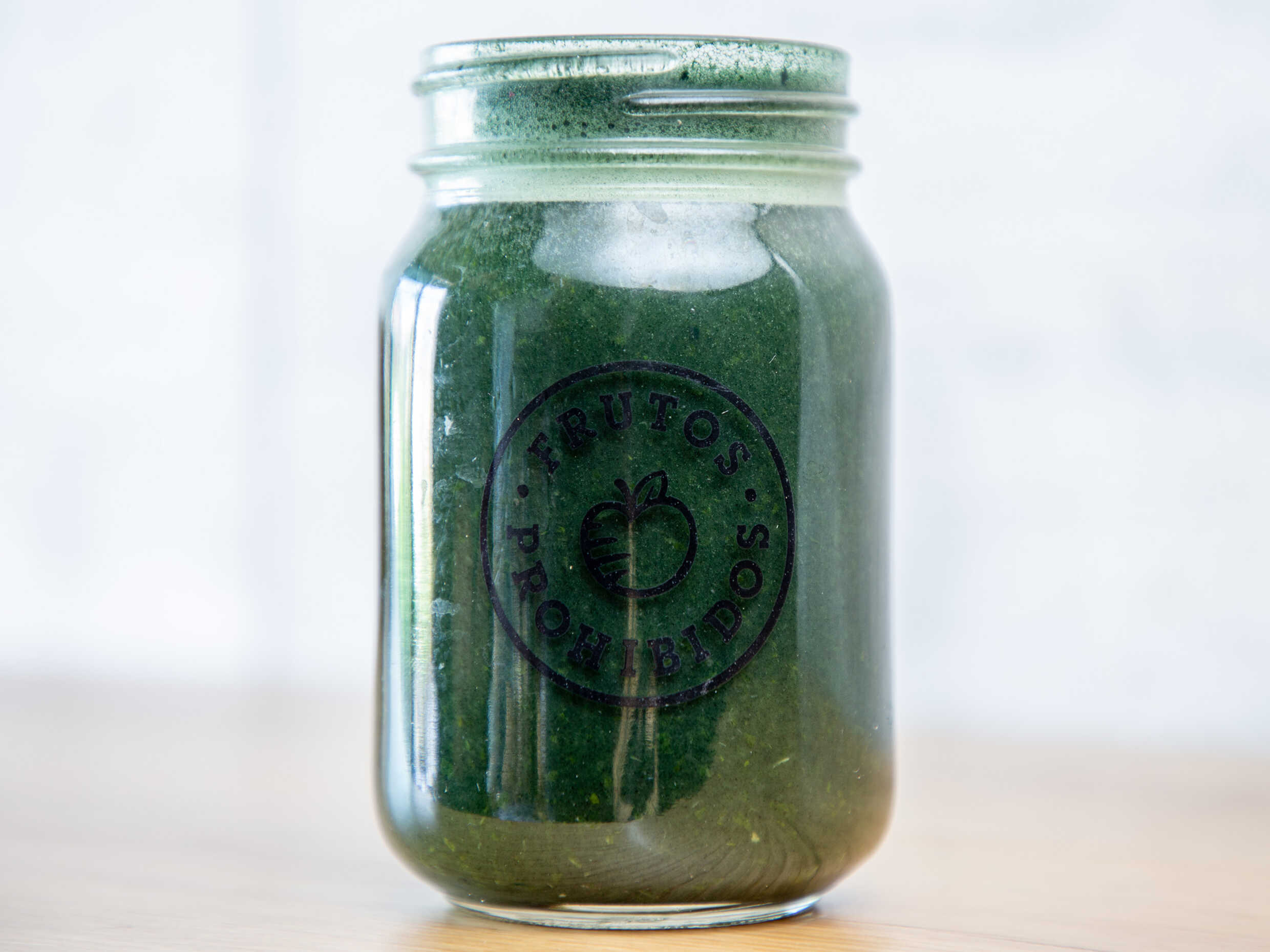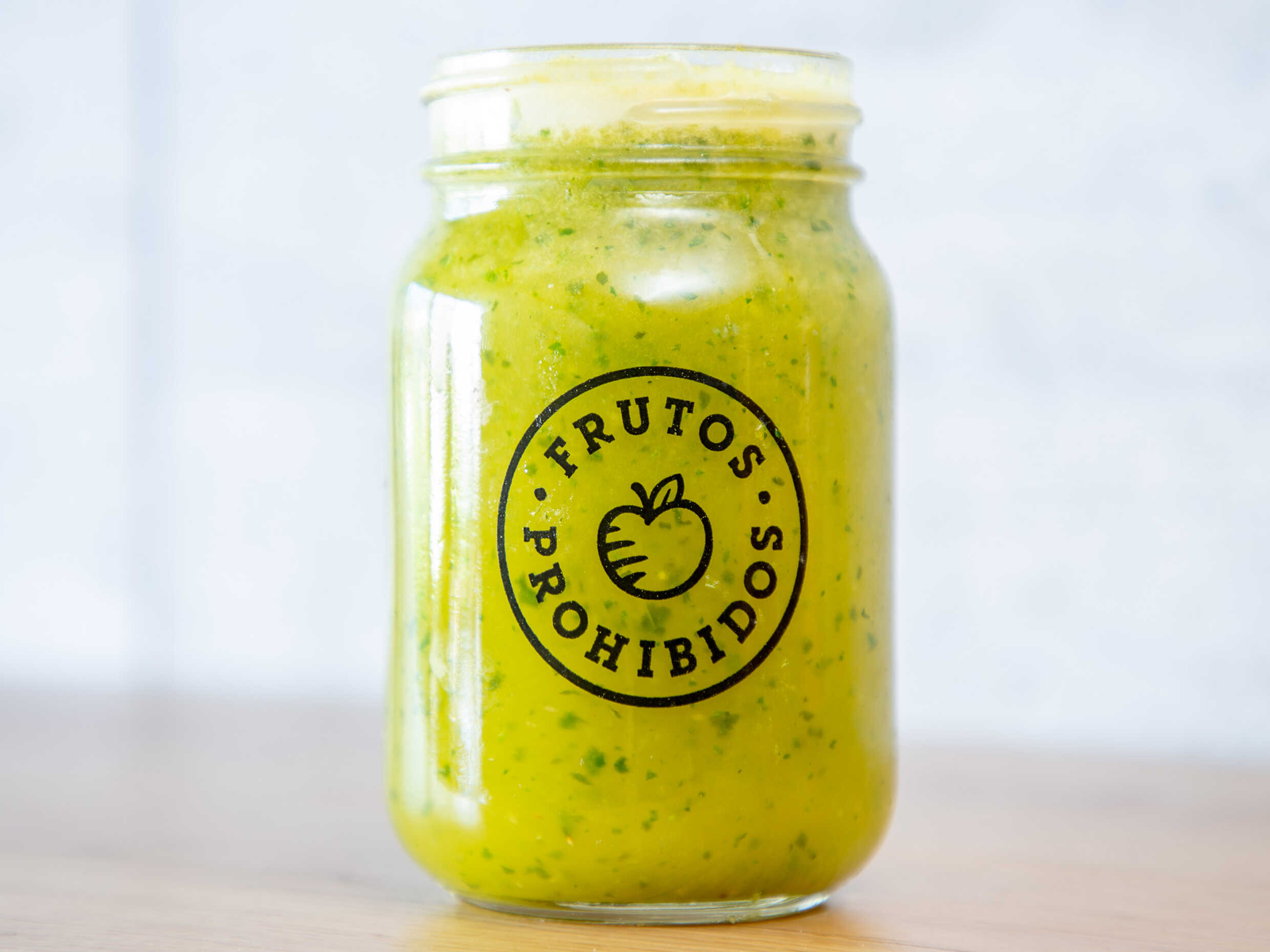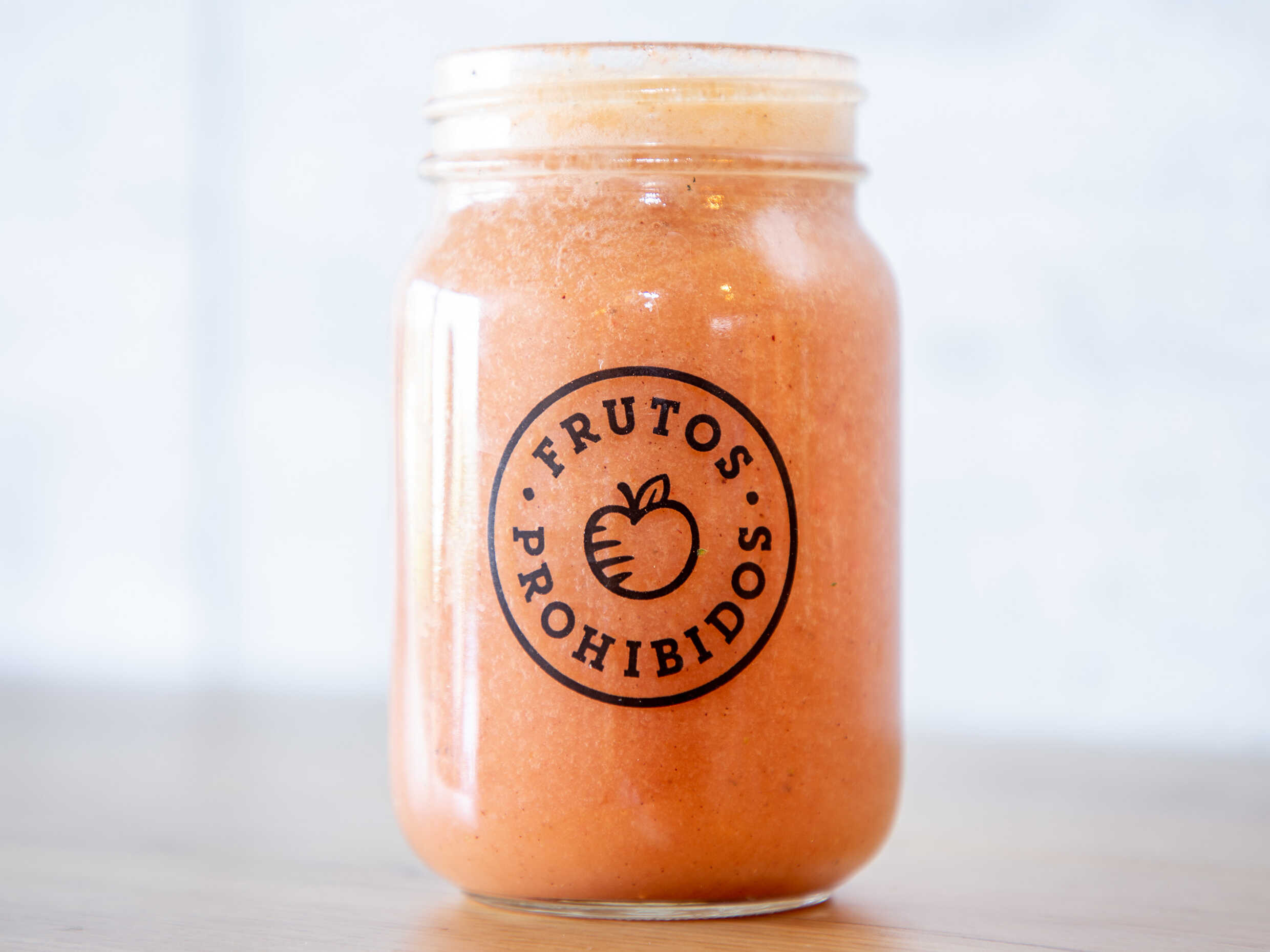 Pimiento morrón, calabaza, brócoli y chile serrano con queso cheddar, aguacate y mostaza. + Shot de sopa de jitomate con albahaca.