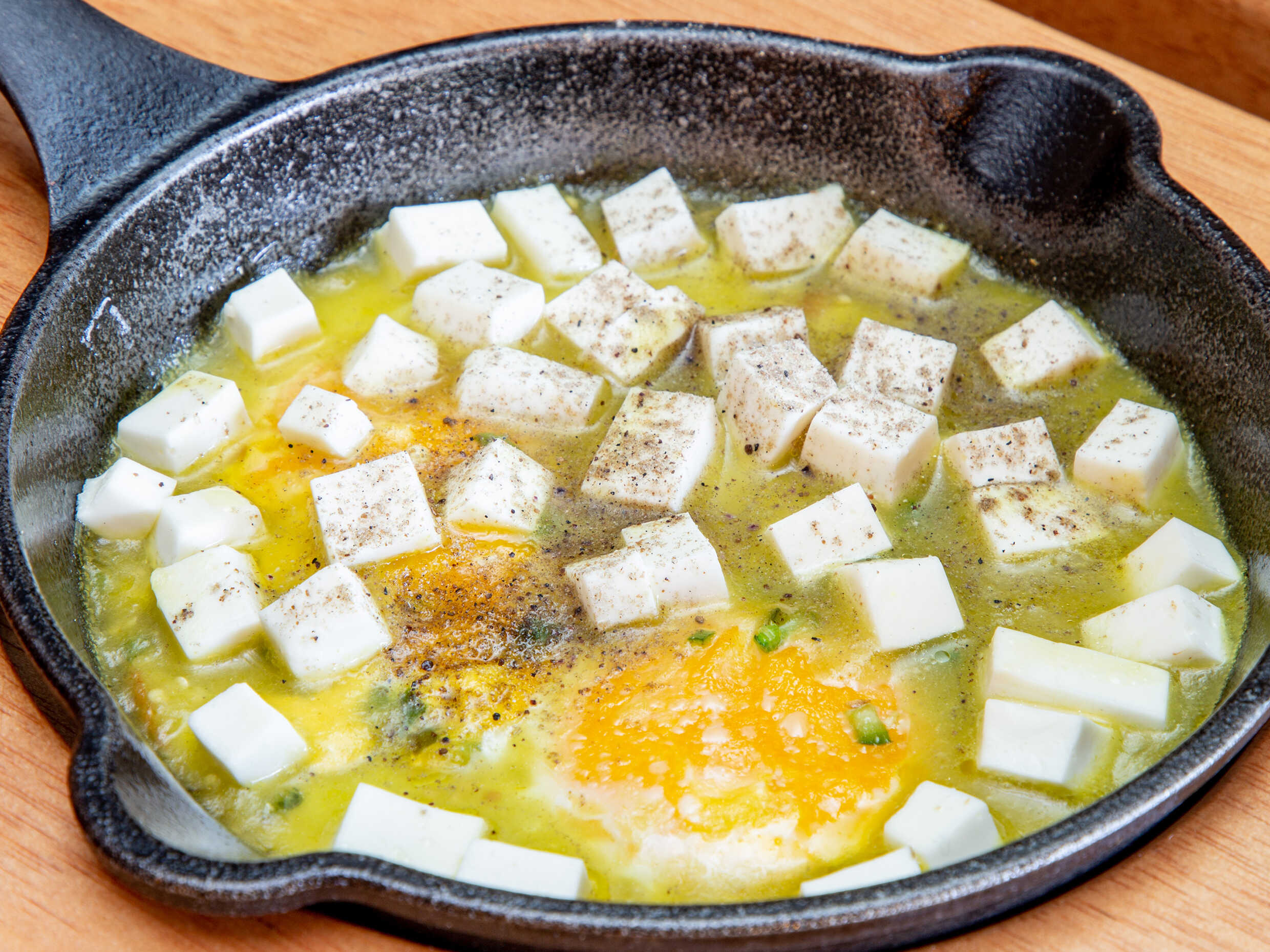Dos huevos orgánicos horneados en cazuela, acompañados de jocoque cremoso, za'atar aromático, cebolla, chile picado y un toque de limón. Un desayuno lleno de frescura y sabor