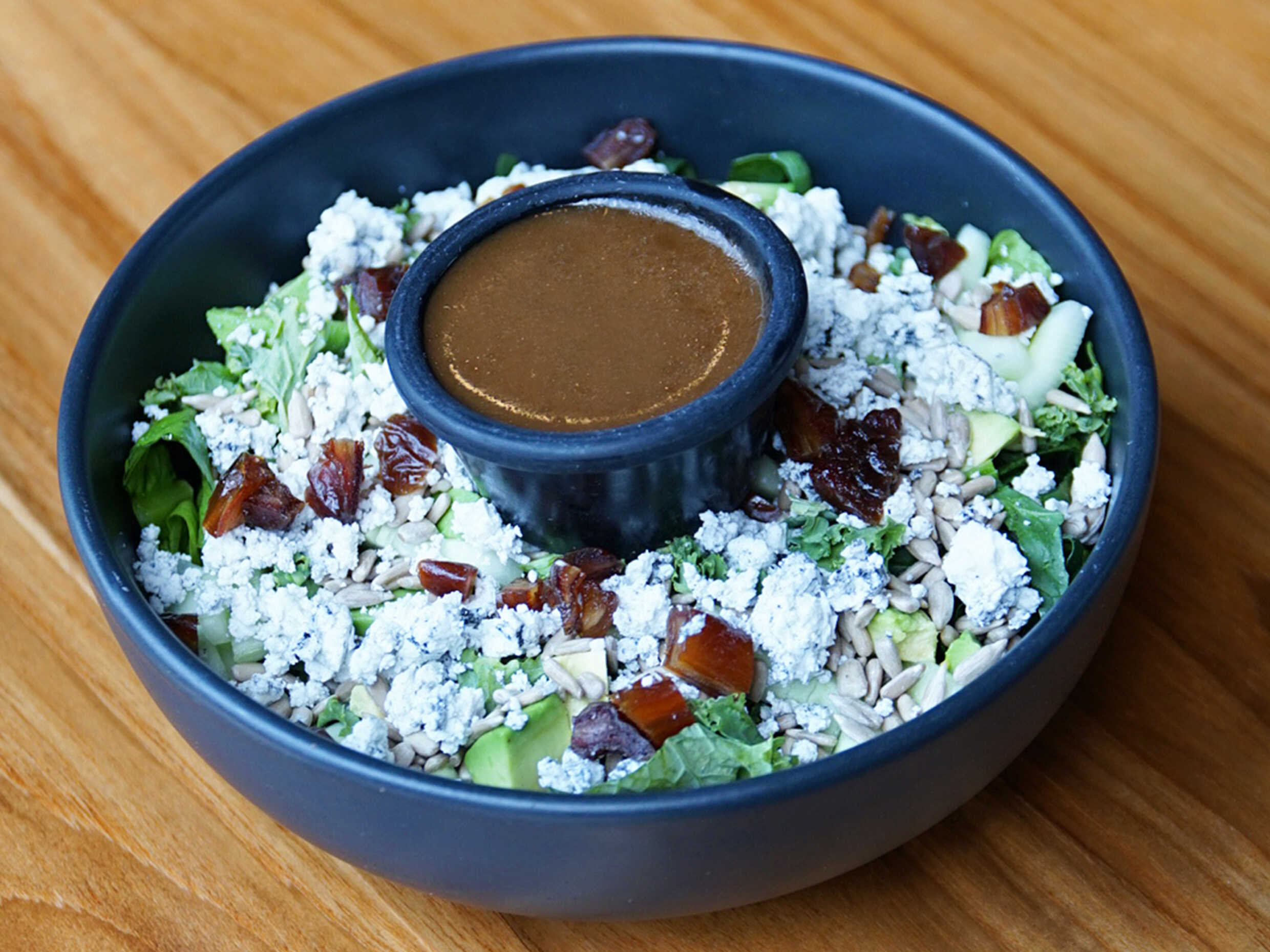 Espinaca, manzana, pistache, dátiles y queso brie.