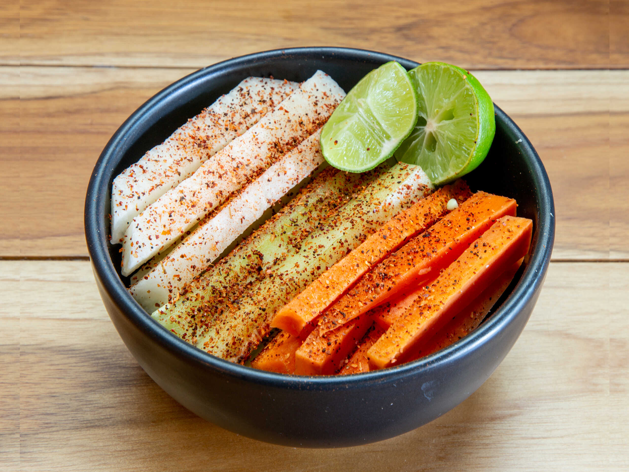 Jícama, zanahoria y pepino con limón, sal y chile piquín.