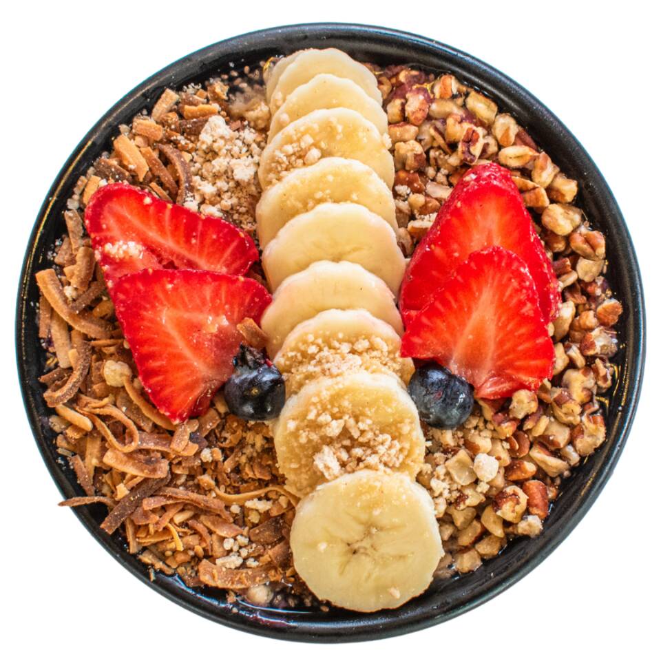Postre natural con mezcla de açaí, plátano, fresas, berries, chía hidratada y coco tostado, coronado con crema de cacahuate o nutella y trocitos de mazapán.