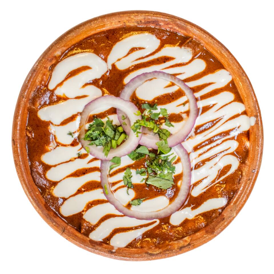 Huevos estrellados bañados en mole artesanal, servidos con aguacate, queso panela, cebolla morada, crema y totopos.