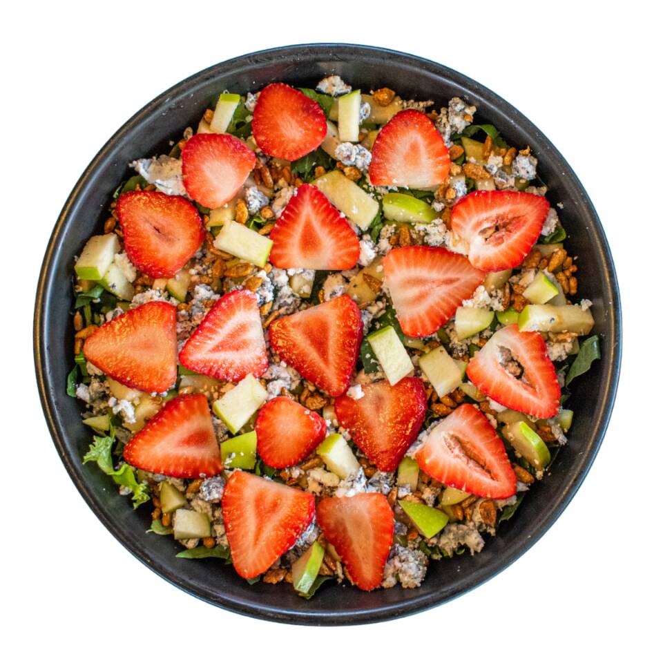Ensalada fresca con lechuga italiana, espinaca, manzana verde y fresa, acompañada de queso de cabra y semillas de girasol garampiñadas.