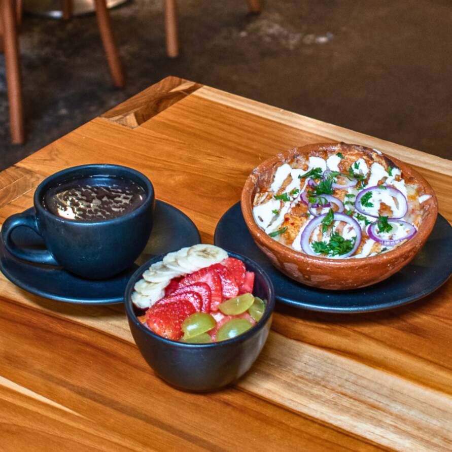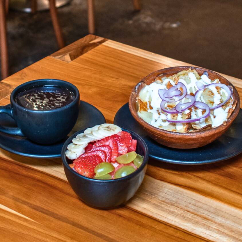 Chilaquiles de mole dulce + café americano + shot de fruta picada