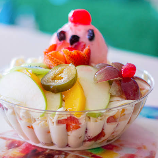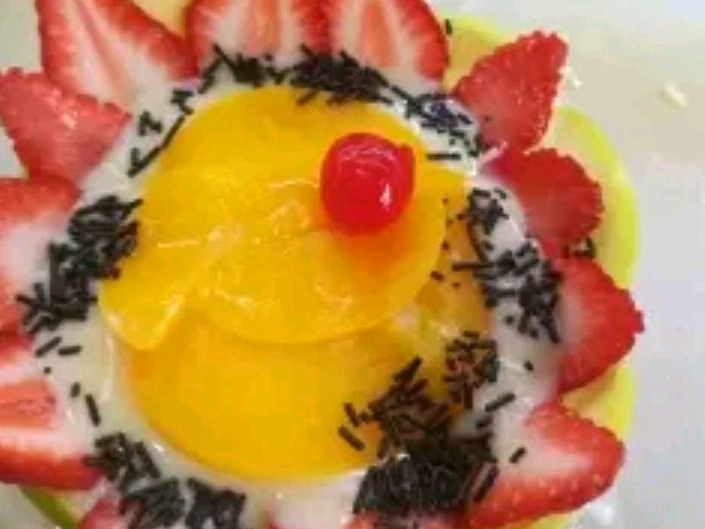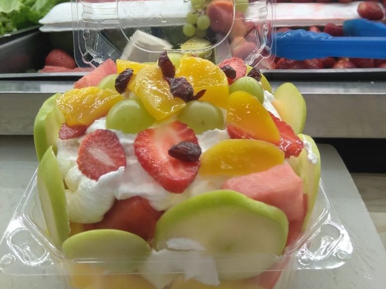 Fresas crema Alpura vainilla canela pasas nuez crema Chantilly adornado con duraznos chipas de chocolate lechera