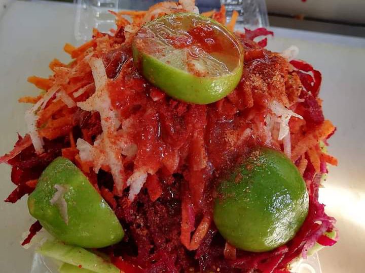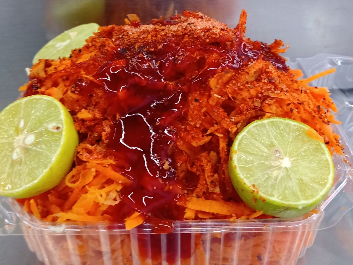 Zanahoria,jicama pepino,chamoy,piquin,tajin,miguelito, limon, y sal
