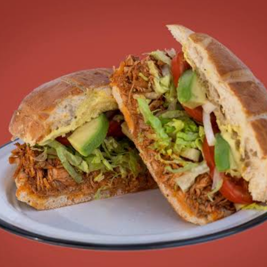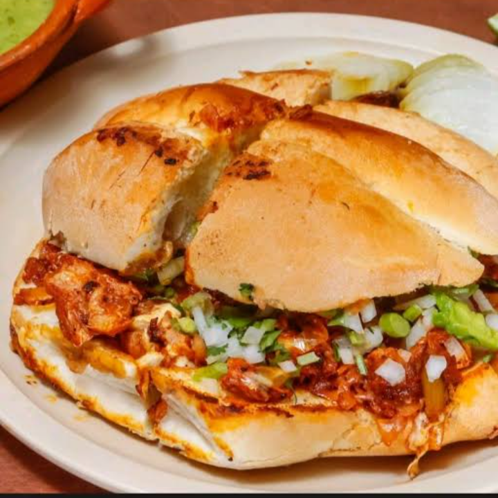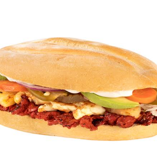 Pastor, sachicha y jamón Aguacate jitomate mayonesa lechuga frijoles rajas o chipotle queso Oaxaca