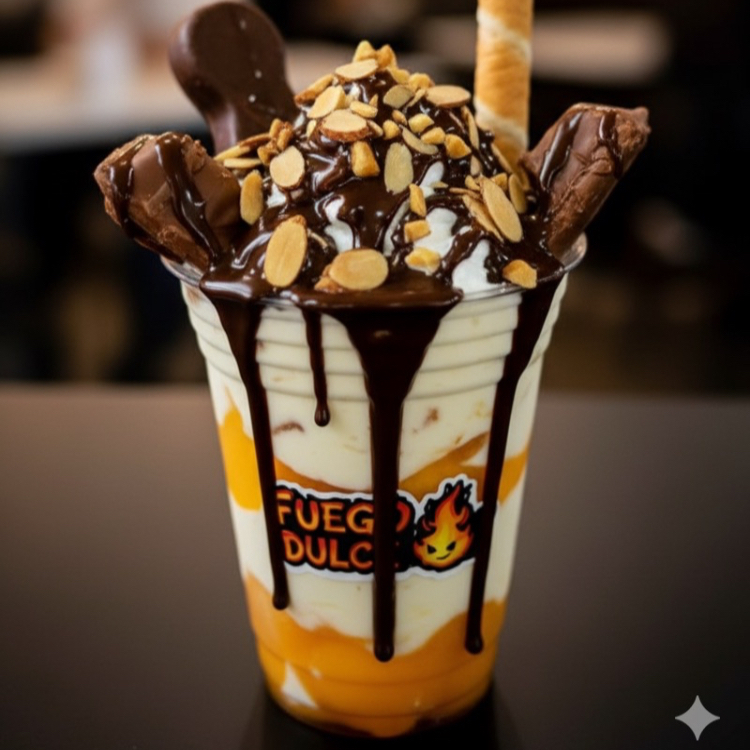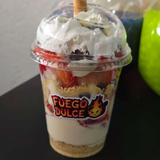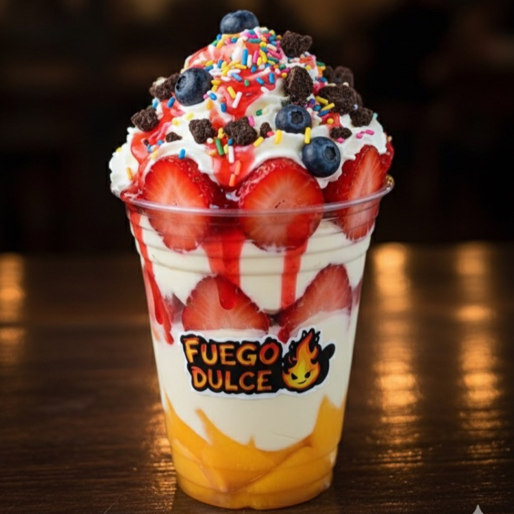 Fresas, galleta, crema, 1 topping y un jarabe a elegir