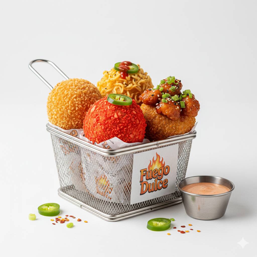 Bolitas empanizadas, son 2 de queso y 2 de salchicha (1 panko, 1 Cheetos flamin hot, 1 papa y 1 ramen)