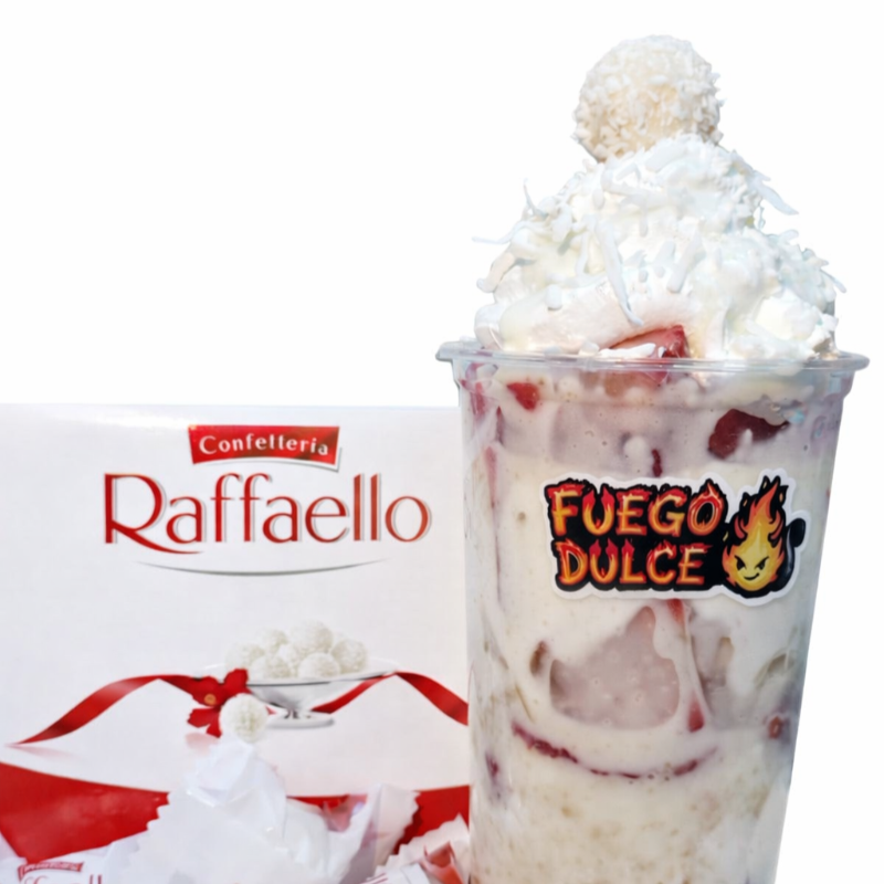 Fresas, crema de la casa, crema raffaello, almendra, coco, chocolate rafaello