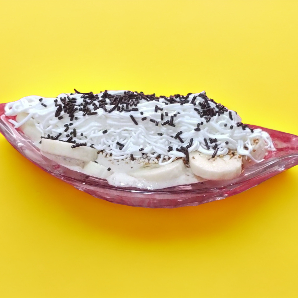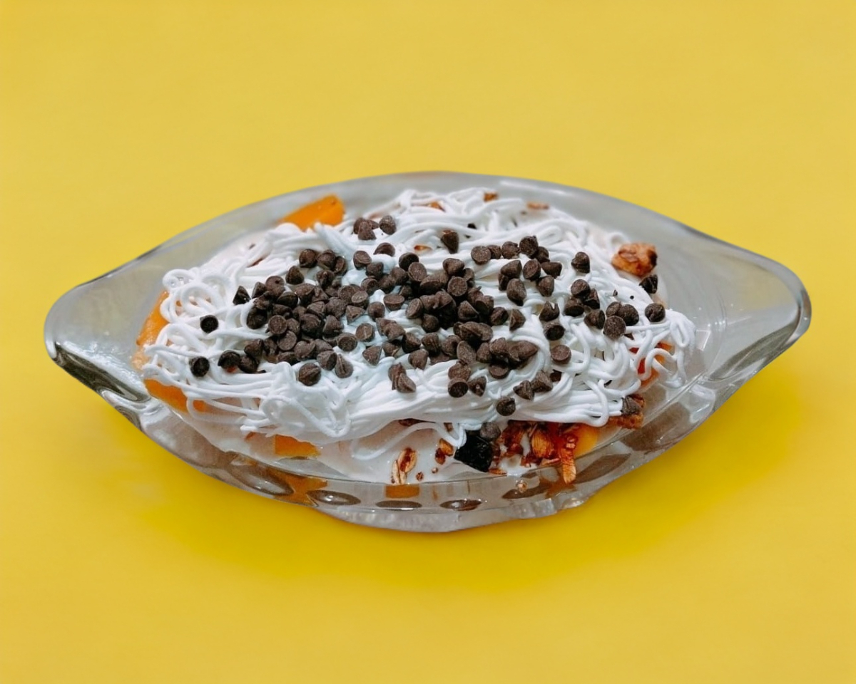 Platanos preparados con crema de la casa, chantilly, granola y chispas de chocolate